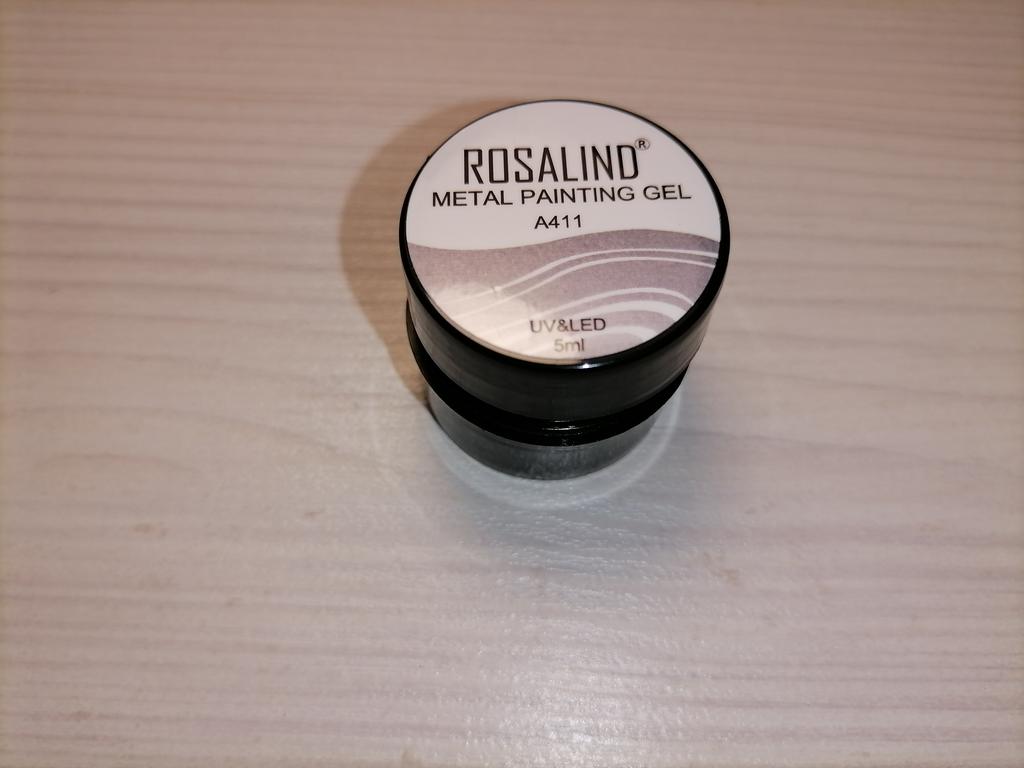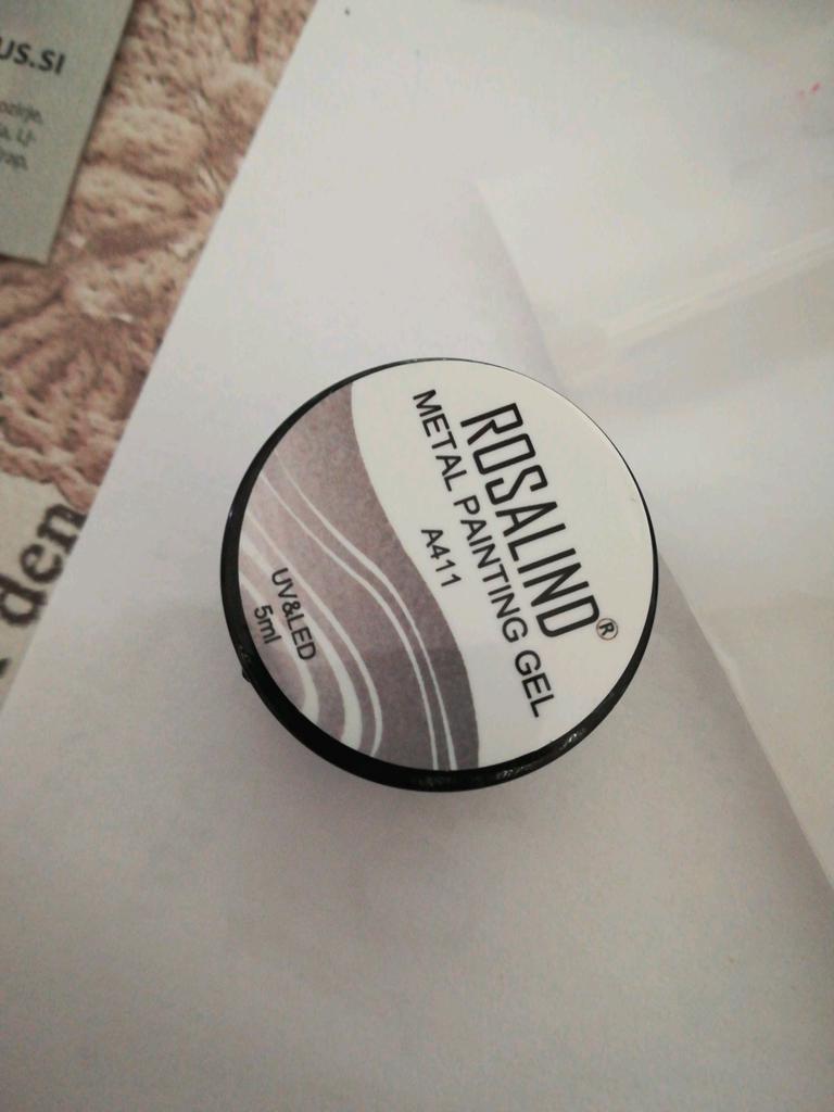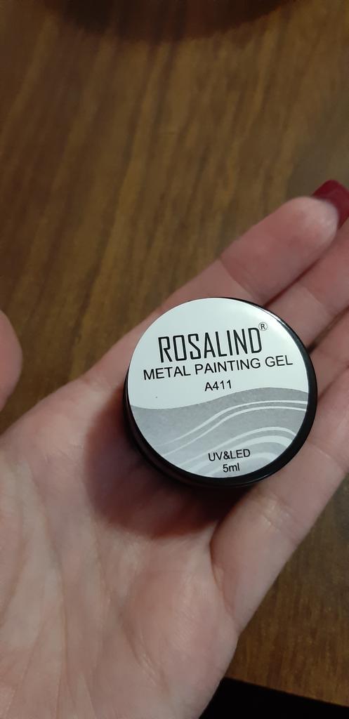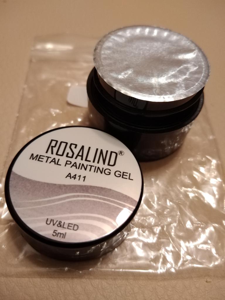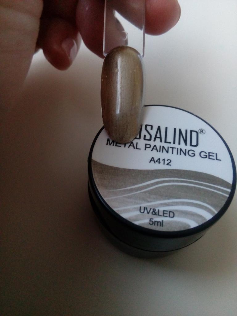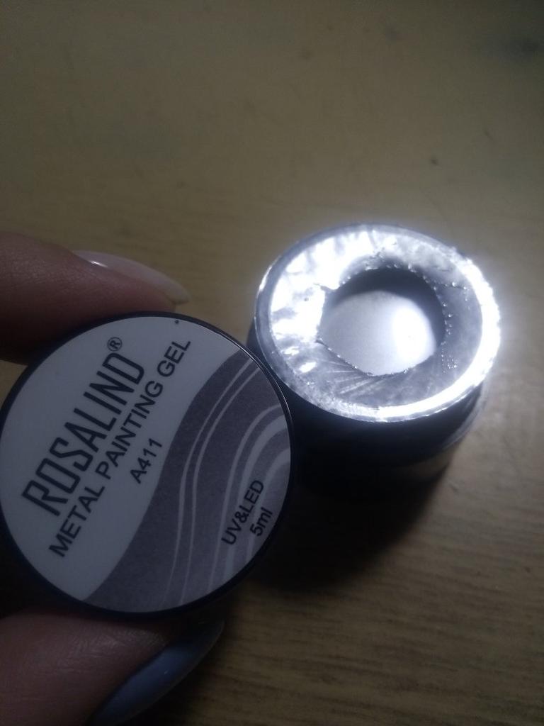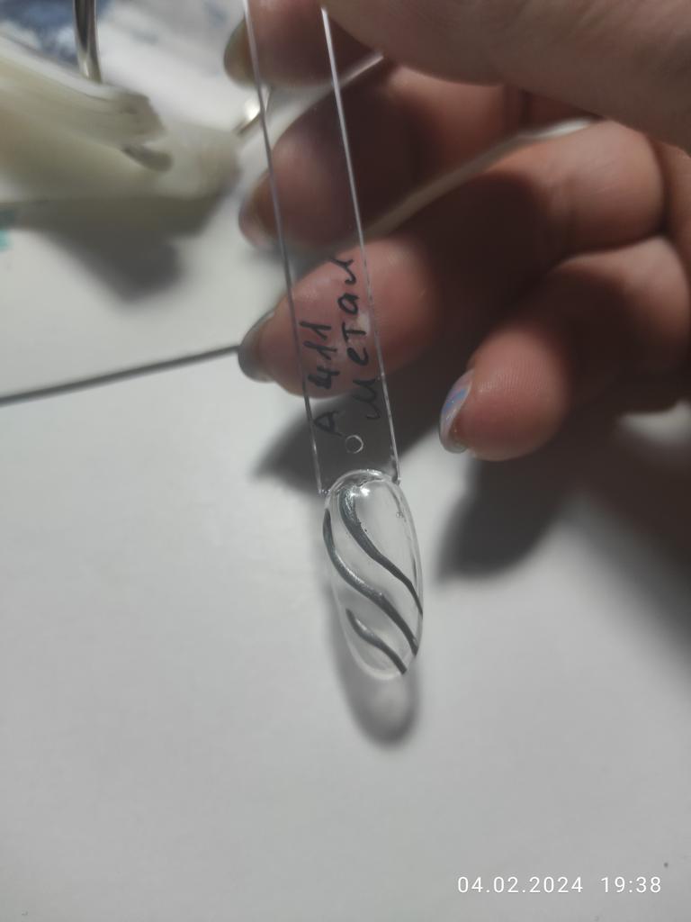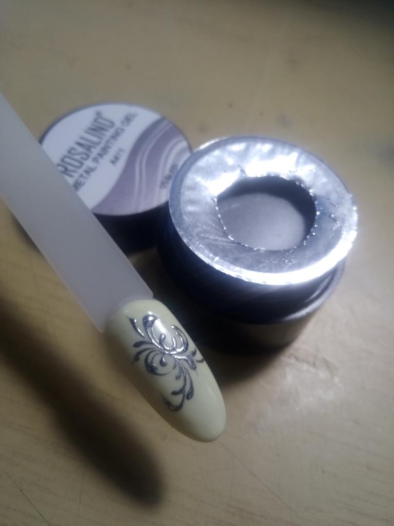 Vzal jsem to na kreslení monogramů. Nezapomeňte zakrýt vrškem. Po polymeraci v lampě barva zkřehne a lze ji snadno poškrábat nehtem. Má kovový vzhled, alespoň se liší od běžného stříbrného laku.
