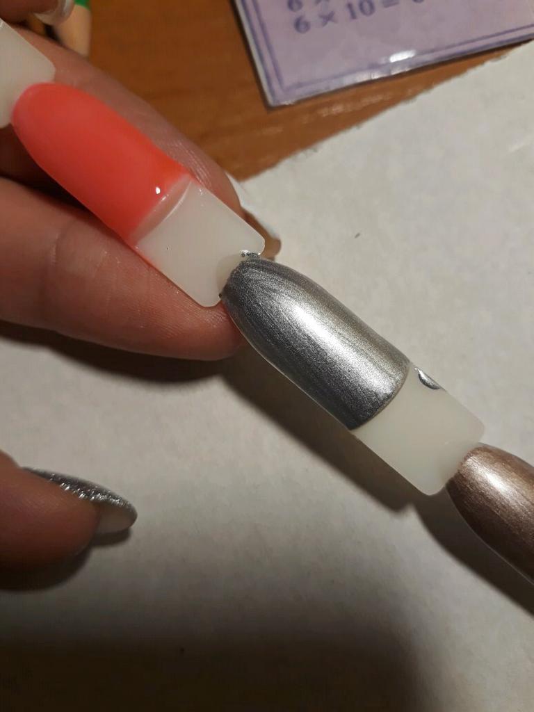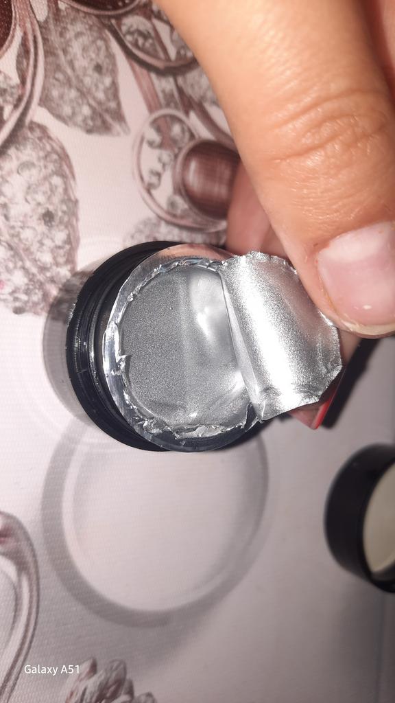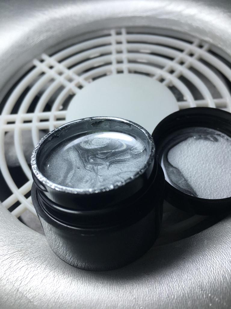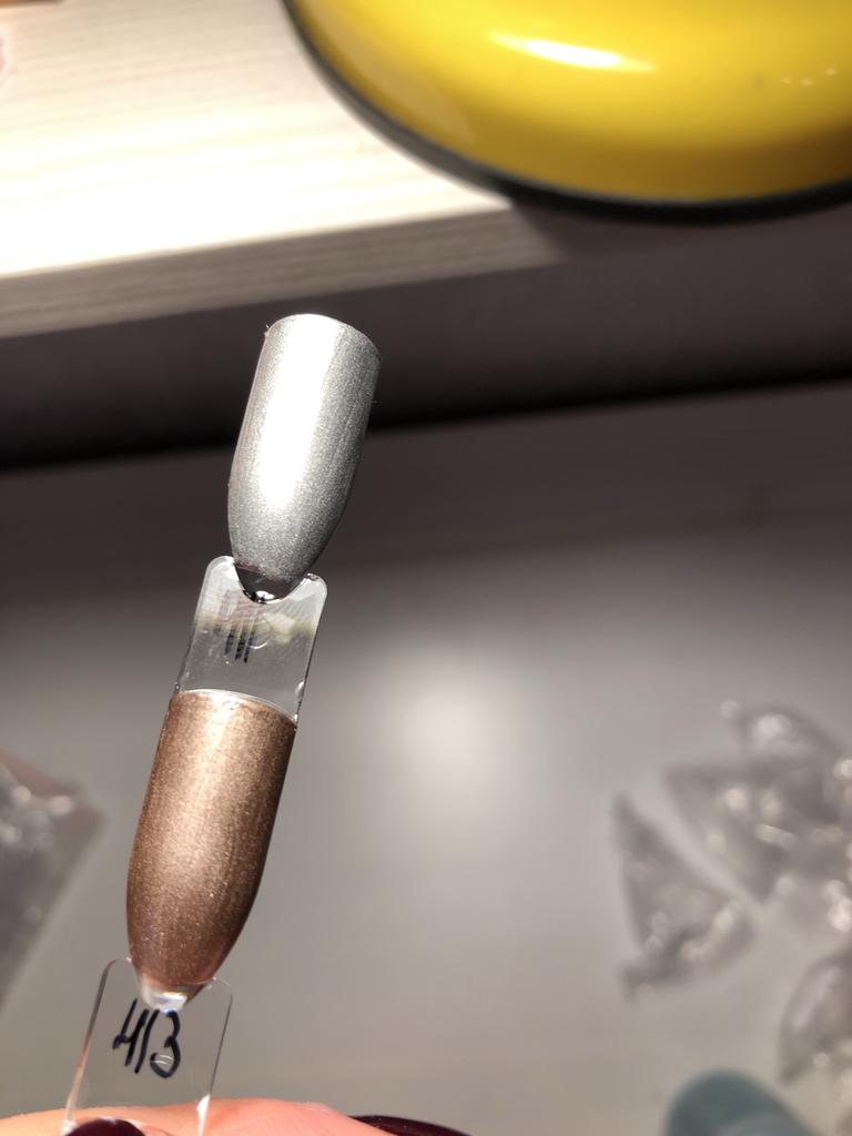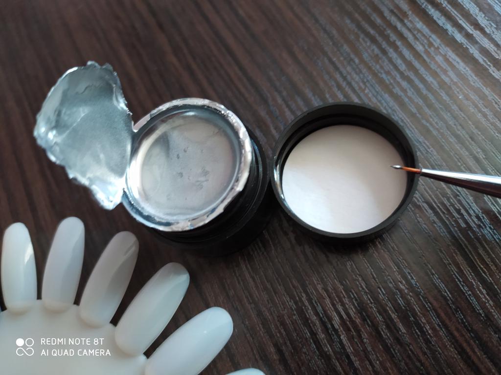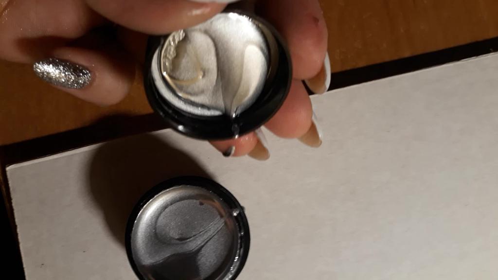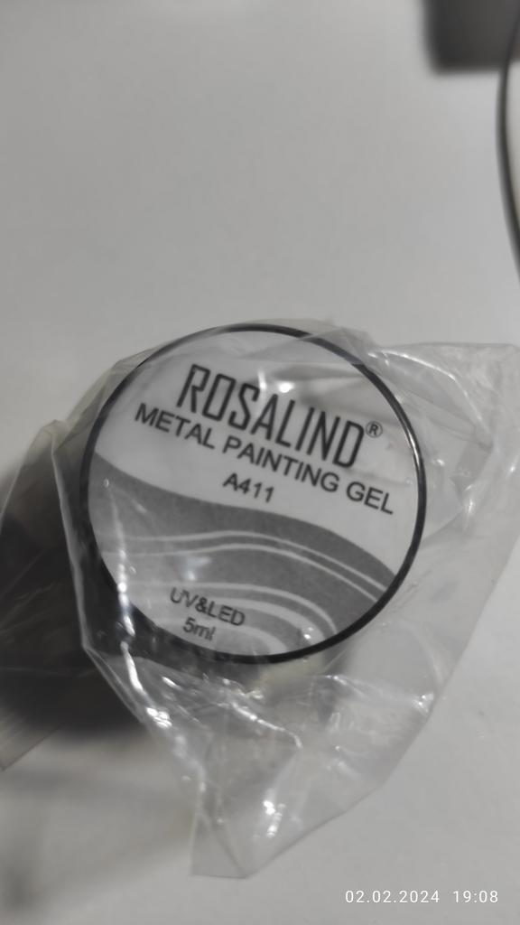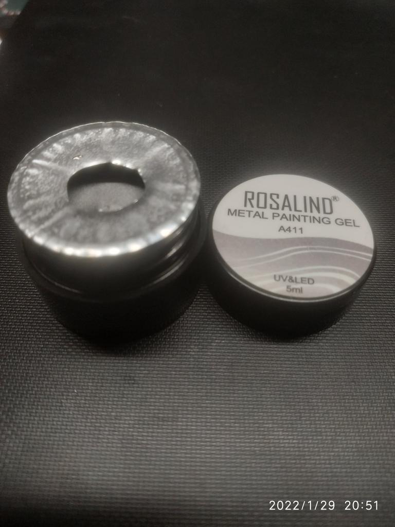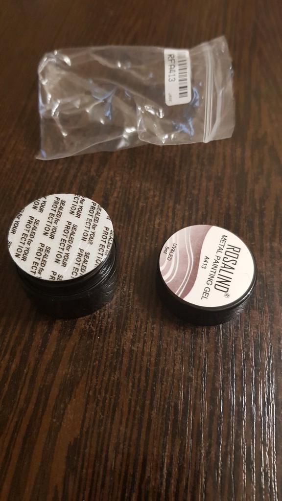 Vzal jsem to na kreslení monogramů. Nezapomeňte zakrýt vrškem. Po polymeraci v lampě barva zkřehne a lze ji snadno poškrábat nehtem. Má kovový vzhled, alespoň se liší od běžného stříbrného laku.