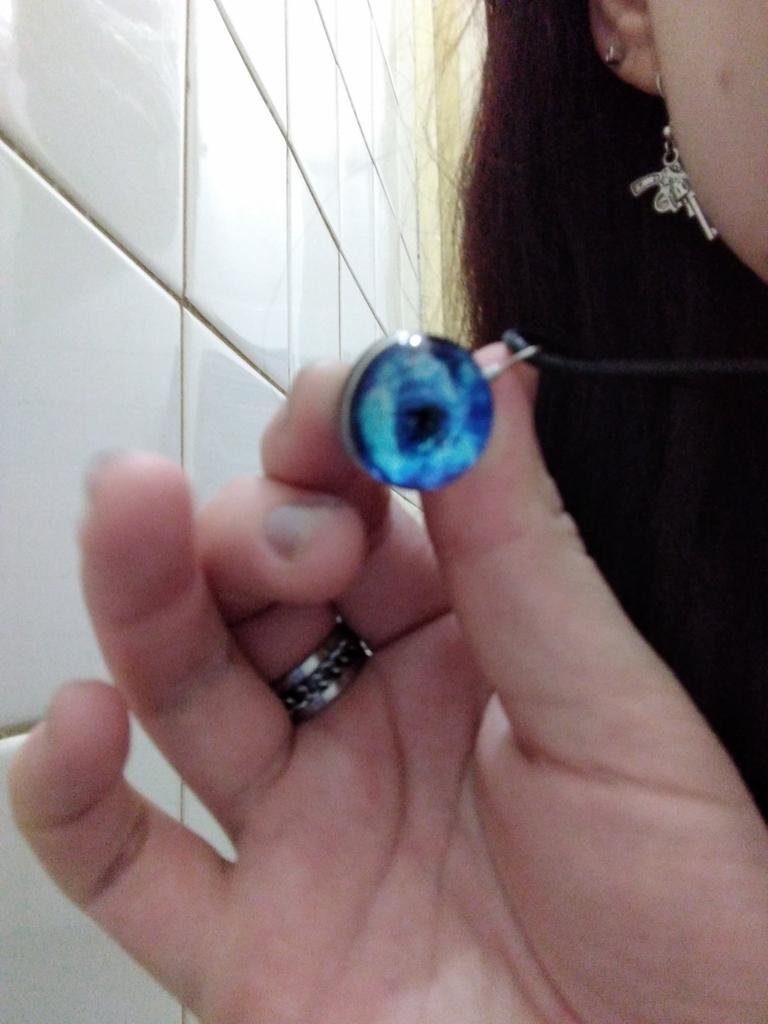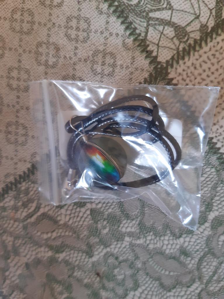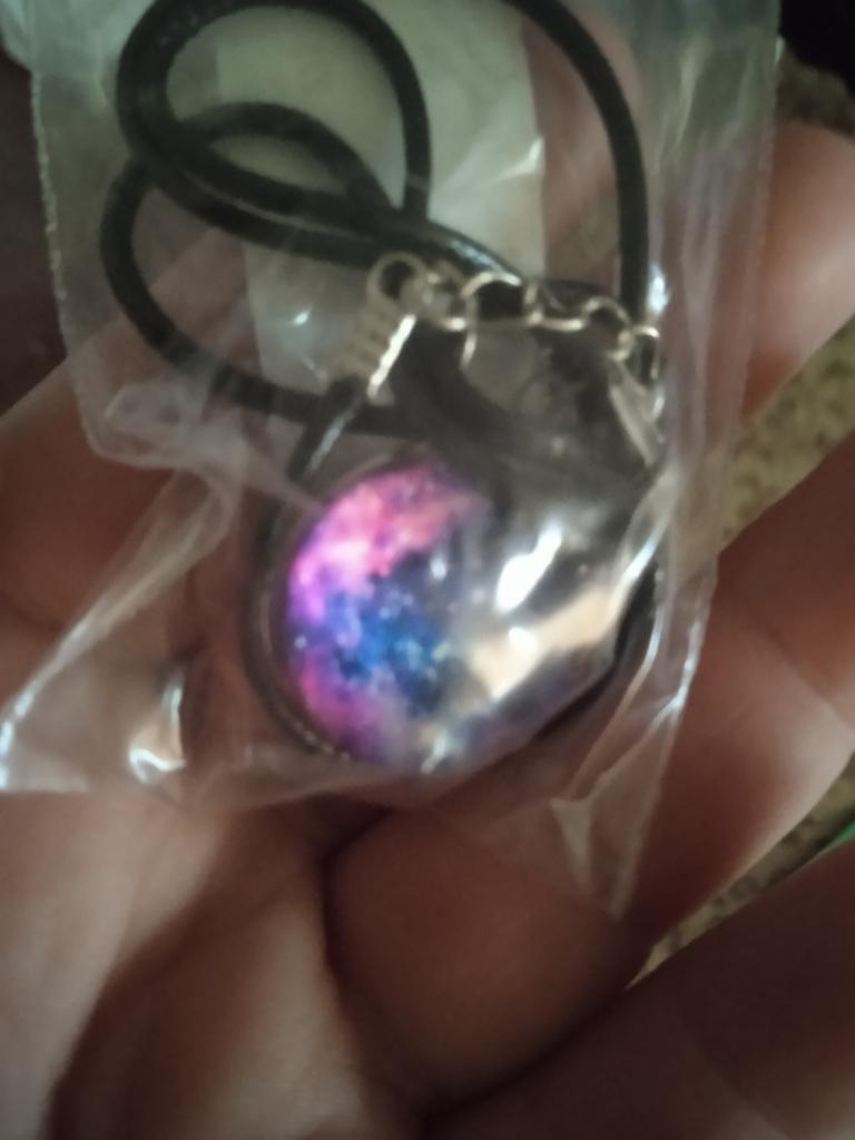 Přívěsek, jako na fotce. Baleno v sáčku a bublinkové fólii. Na černé šňůře, krajka se zámkem. moc se mi to líbí.