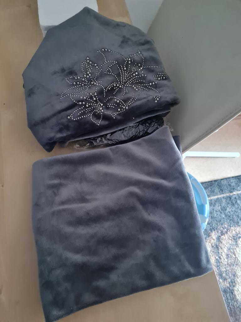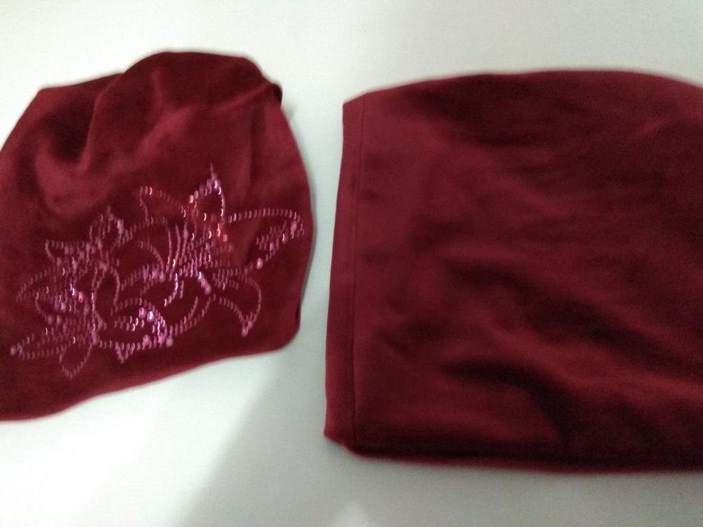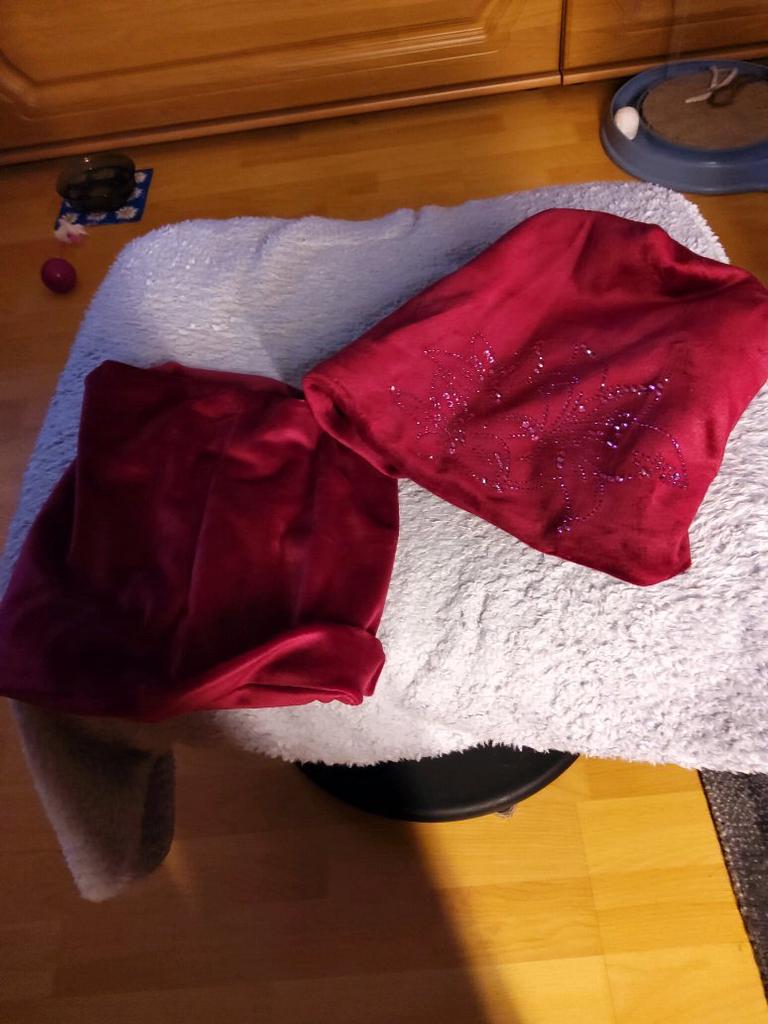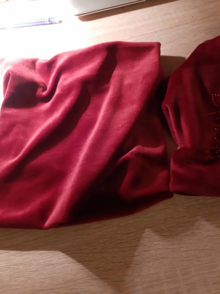 Velmi pěkný set, měkký na dotek. Barva jako víno. Materiál je samet a na spodní straně fleece.