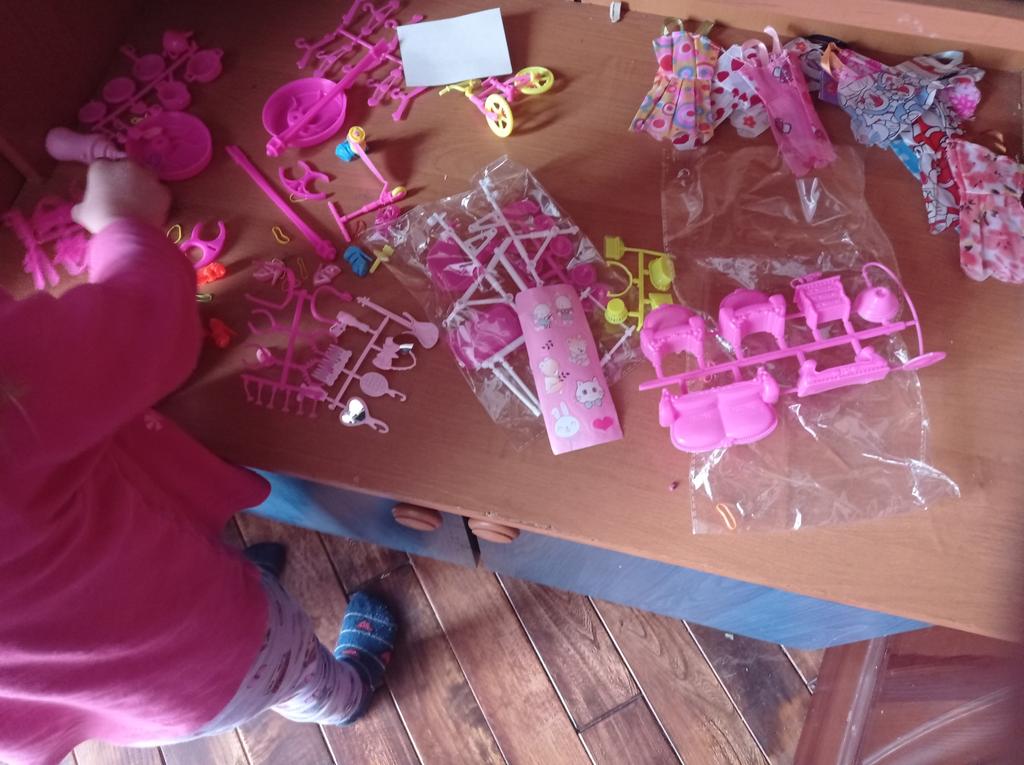 Výrobky jsou pěkné ale kvalita trochu ponechává na přání.Potom ve velké tašce jsou předměty pro Barbie,oblečení a boty.Nábytek je smíšený.Nábytek obsahuje jednobarevný díl.Obývací pokoj pro miniatury,které mohou přizpůsobí se malým panenkám Barbie.Hrnce a naběračky jsou vhodné.do domečku pro Barbie,správná velikost,ručně vyrobené oblečení vypadá jako papír,ale přesto roztomilé,líbí se mi výborné podstavce
