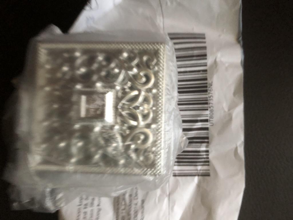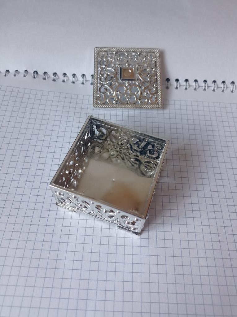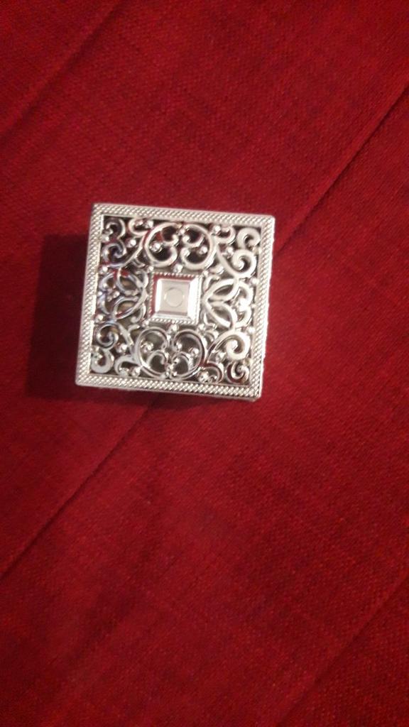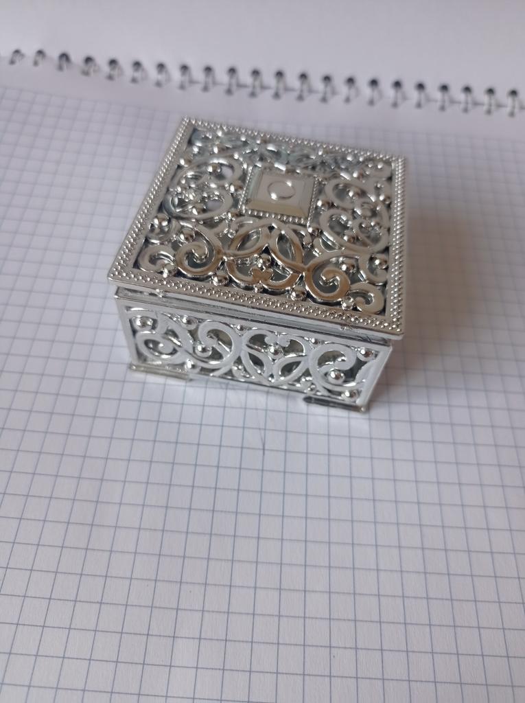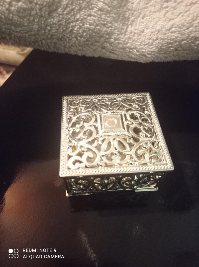Malá postříbřená ozdobná krabička. Plastický. Ale může být na drobné šperky. Děkujeme za produkt!