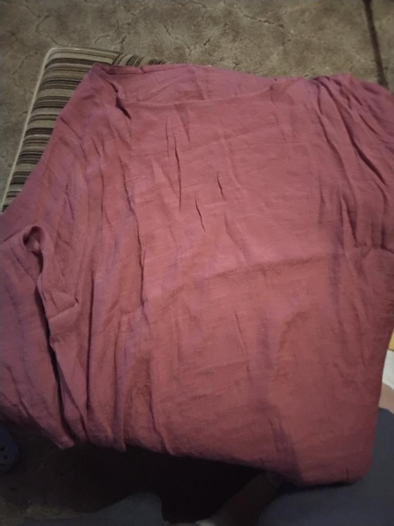 Halenka je úžasná. 💜 Látka je velmi tenká a lehká, i když je průsvitná. Složení: 65% bavlna 👌 a 35% polyester. Textura látky se zdá být zmačkaná, i když je pečlivě vyžehlená. Nosím velikosti S nebo M. Halenku jsem si vzala velikosti M, aby byla volná a pohodlná. Rukávy lze vyhrnout, takže halenka vypadá přísně a poddajně. Díky obchodníkovi. 🌹
