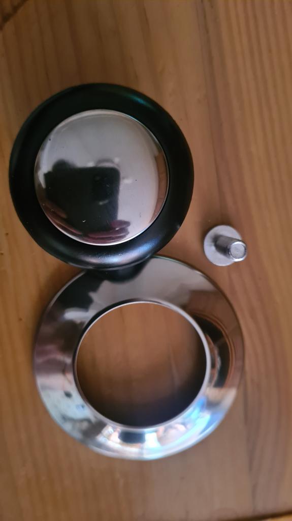 1 ks úchytu, naprosto pěkně pasuje na pokličku. Balení obsahovalo vrchní úchyt s krycím kovovým kroužkem a šroubek. Chyběla ale podložka pod šroubek, která musí být ze spodní strany pokličky. Použila jsem jinou, ale považuji to za nedostatek. Celkově ale spokojenost