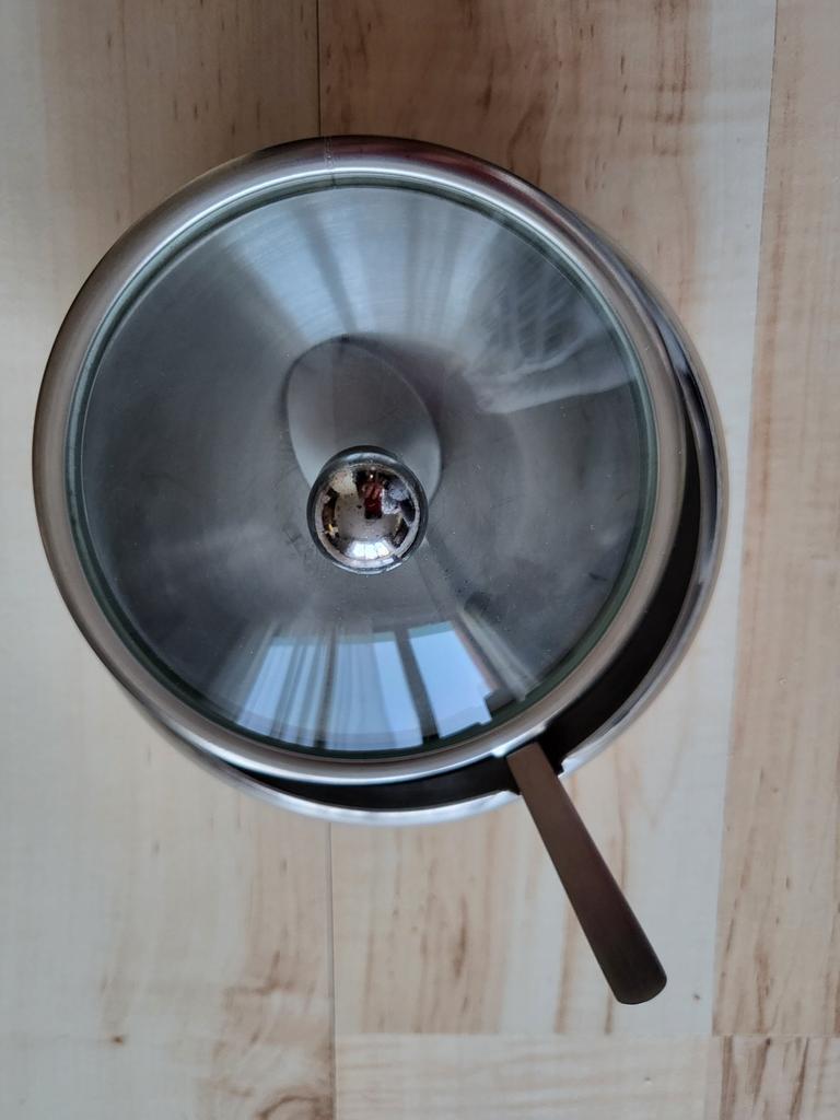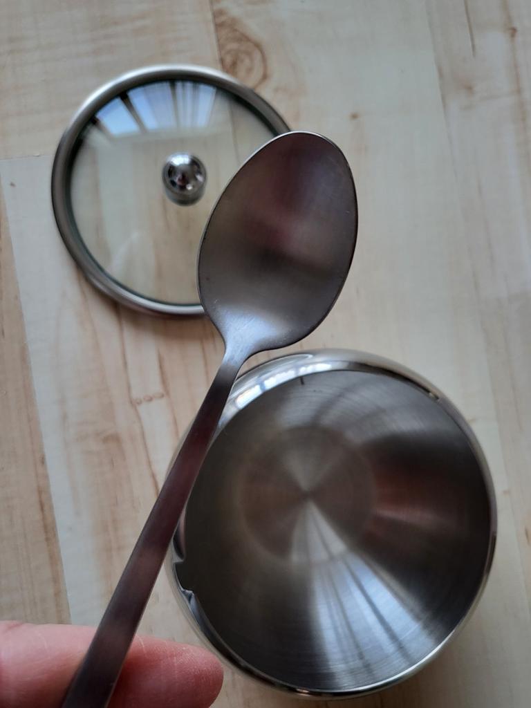 Ocelová cukřenka. Sada obsahuje lžíci a ocelově skleněnou poklici. Pěkný vzhled. Doporučuji.