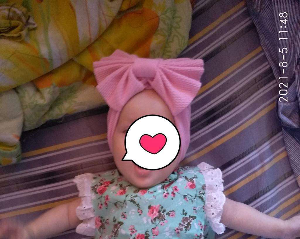 Čepice je prostě bomba!!!!!!Mašlička je velká,látka dobrá!Na fotce má dcera 3 měsíce