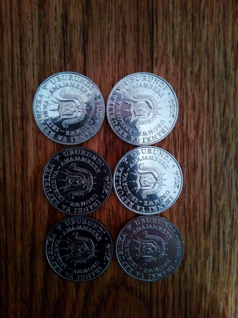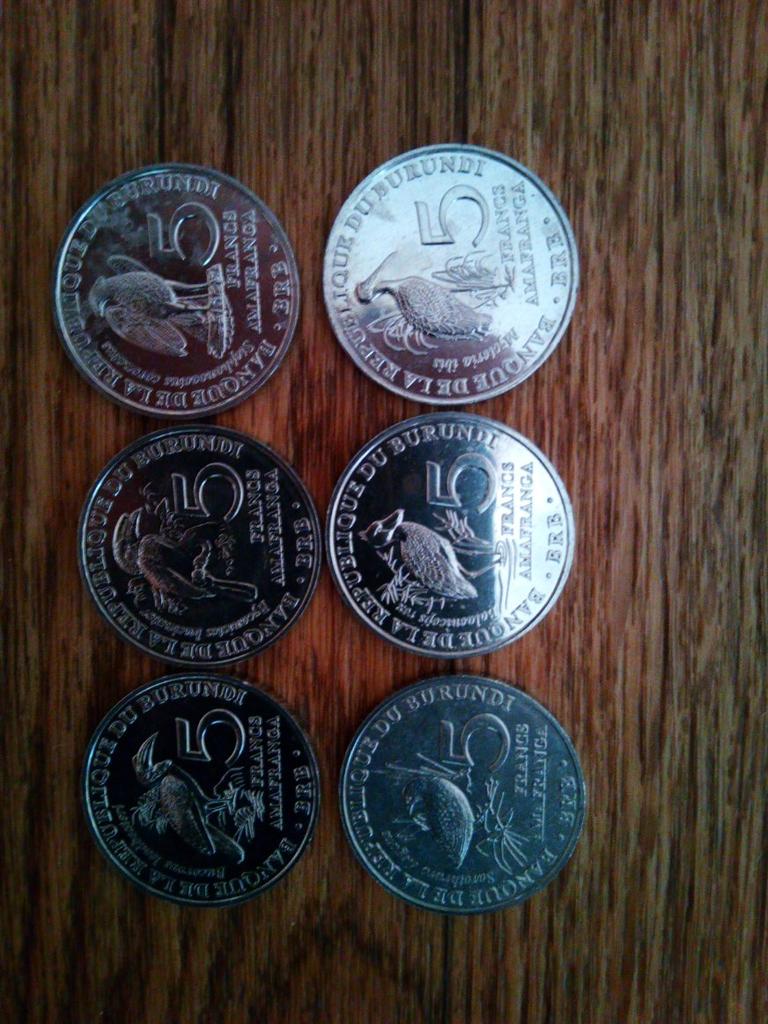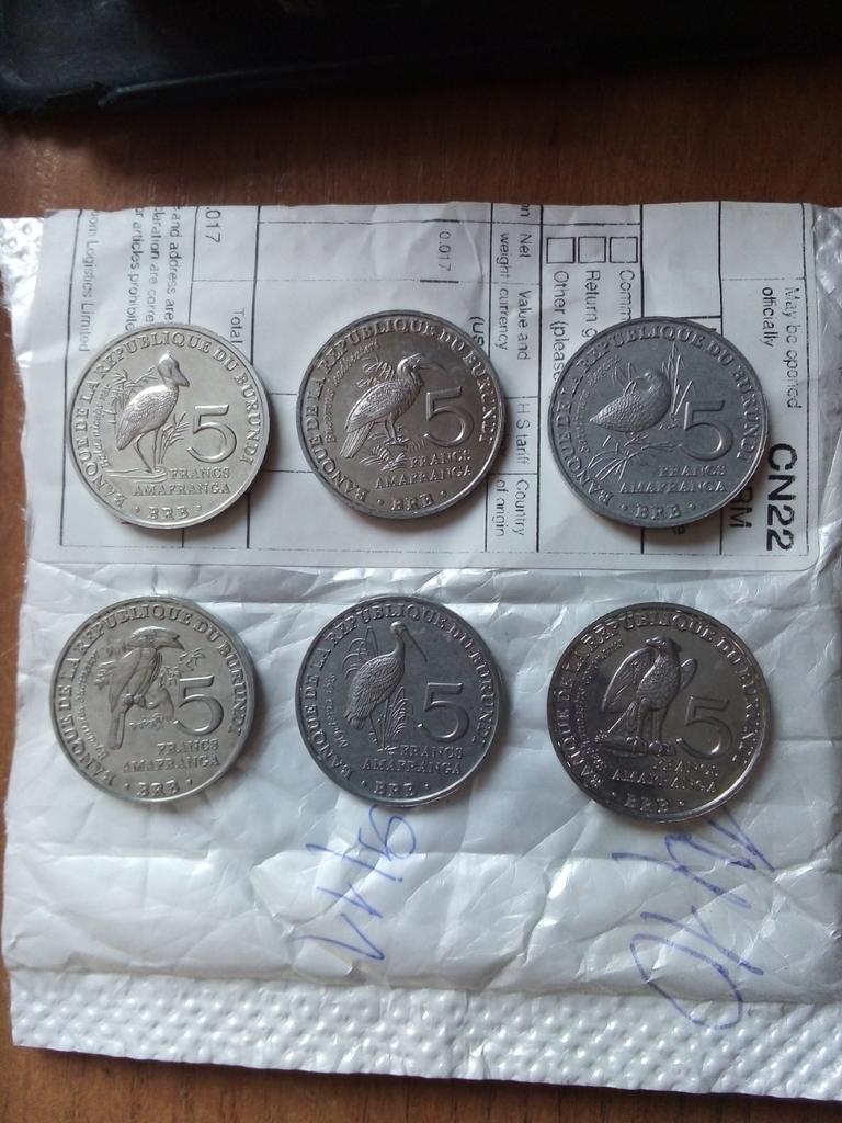 6 různých mincí Burundi, nominální hodnota 5 rud, s obrázkem ptáků. Hliníkové jsou pravděpodobně velmi lehké.