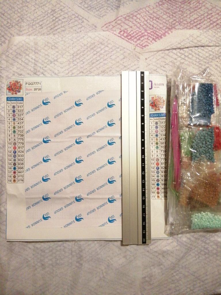 Má rozměry 20 x 20 cm. Dodává se s nástroji a barvami stejnými jako na fotografiích. Dobrý produkt, dorazil včas. Děkuji Joom 🐱