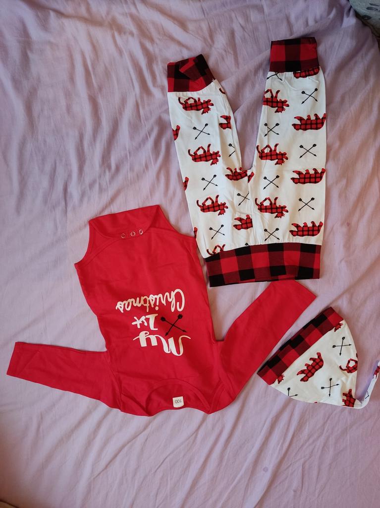 0-24M novorozenci Chlapci Dívky Můj první vánoční kombinéza + Kostkované kalhoty + Čepice 3ks oblečení Oblečení