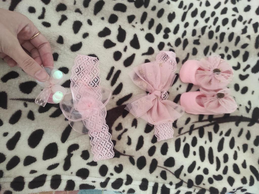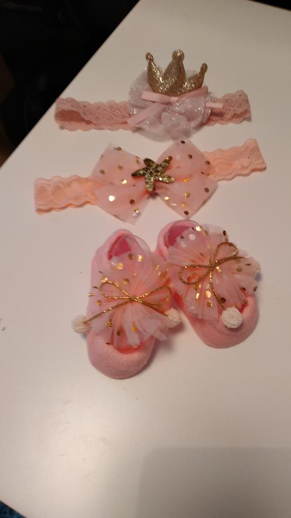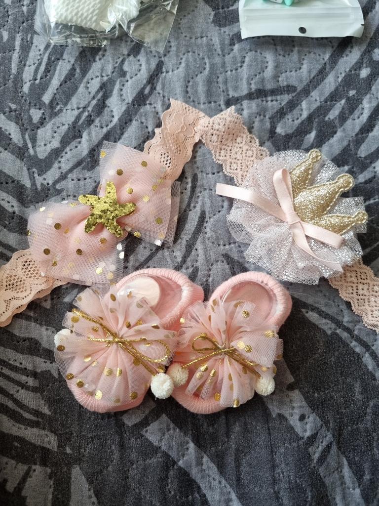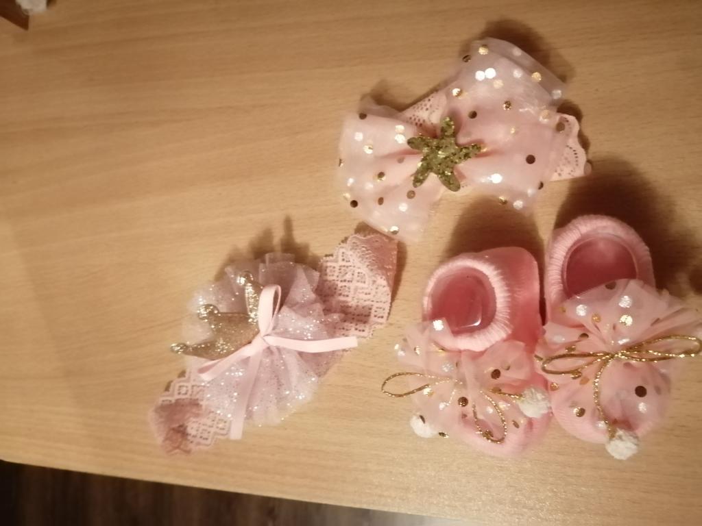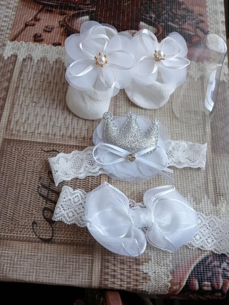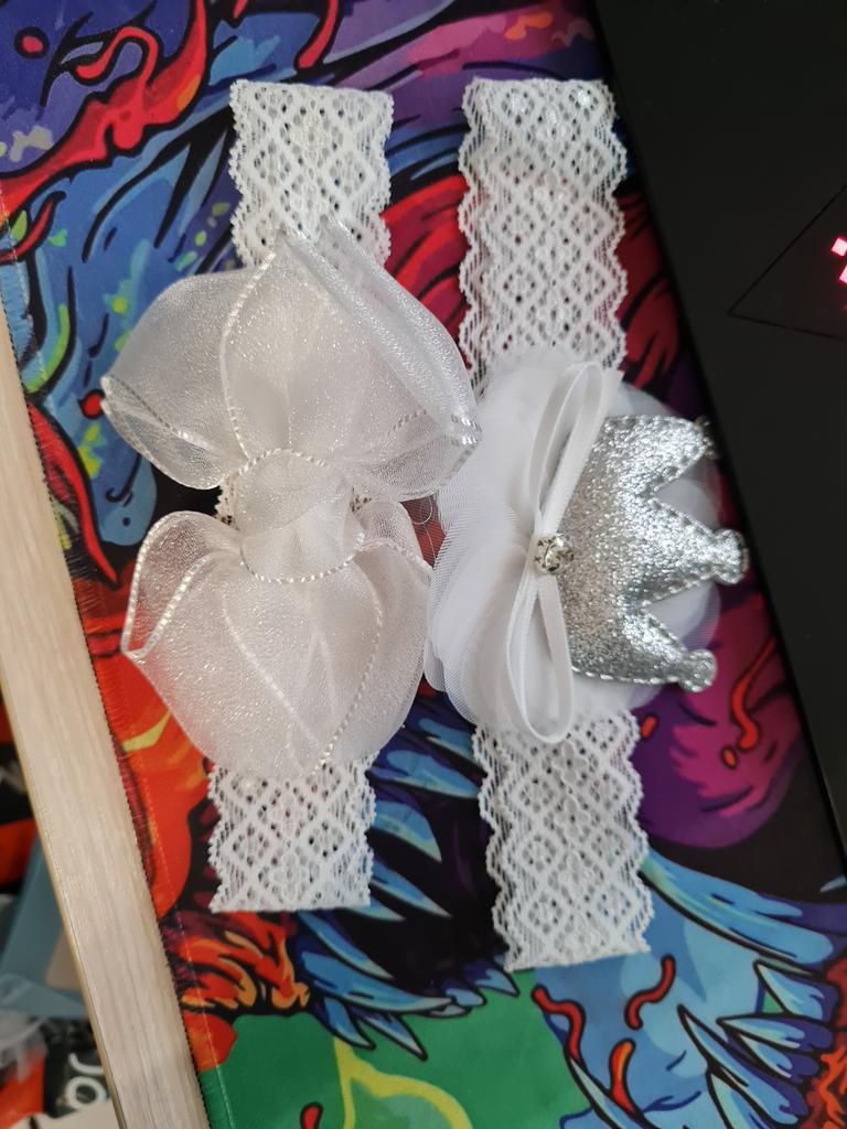 Zboží dorazilo ve dvou balících, nepoškozené. Sada plně odpovídá fotografii. Velikost je asi dva až tři měsíce. Malému je 1,5 měsíce, takže převazy jsou trochu velké, ale není to nic hrozného. Češi jsou na jejích nohách tak akorát, ale do měsíce, myslím, půjde i utáhnout. S výrobkem jsem naprosto spokojen. Všechny mašle perfektně drží, nejsou ošoupané, stuhy jsou celé, bez švu, dobře se natahují a zároveň jsou měkké, aby netlačily na hlavičku.