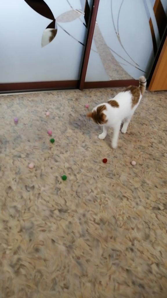 Kočka šílí z těch malých kuliček, koupených několikrát, vždycky ty koule zase někde najdou 😃😃