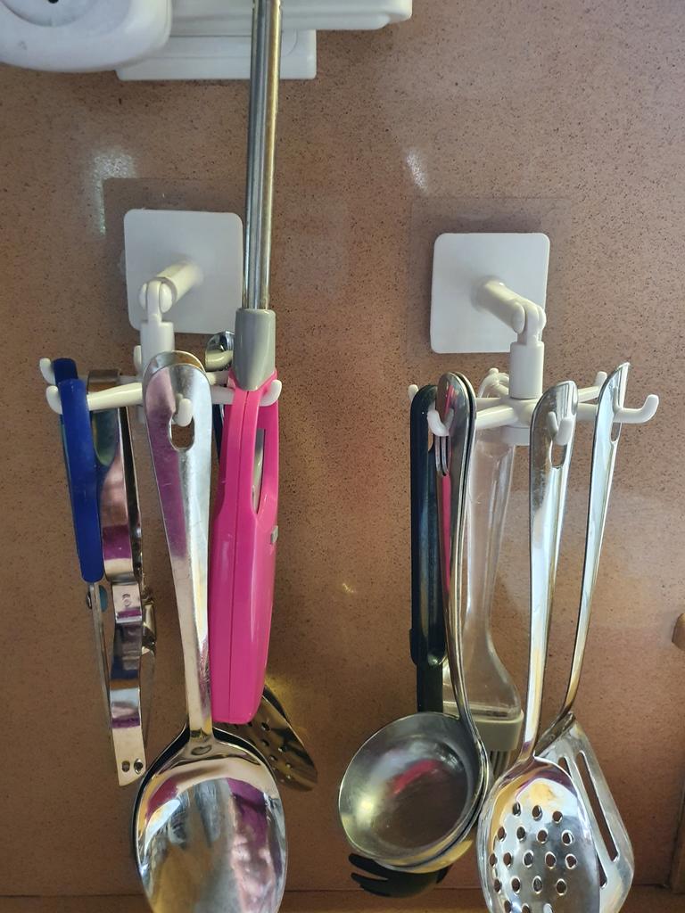 Praktický systém pro zavěšení kuchyňského náčiní. K připevnění pod kuchyňskou skříňku pomocí dodané nálepky