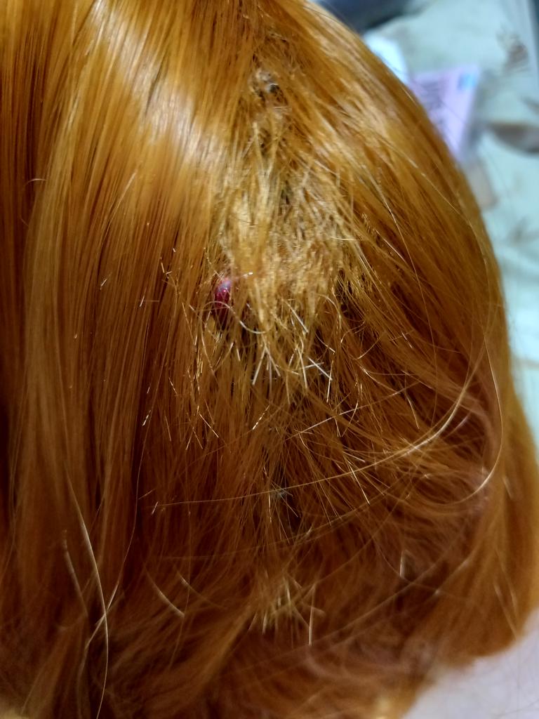 Ofina je zastřižená jako žínka, pokrytá malým množstvím normálních vlasů...velký objem "čepice". Zbytek je normální