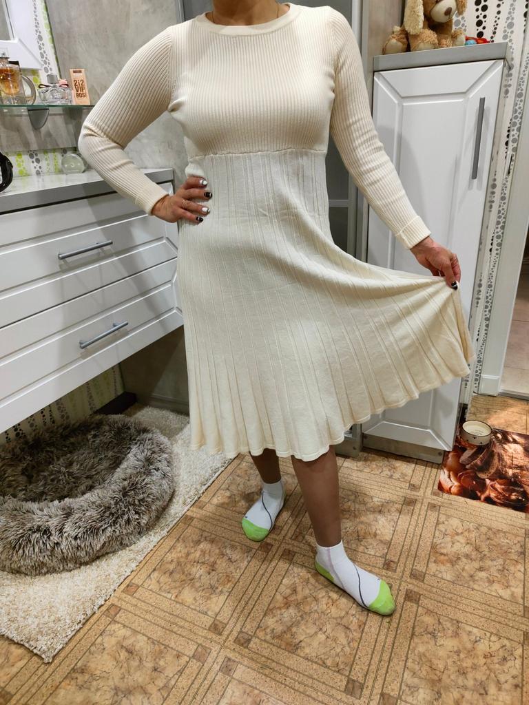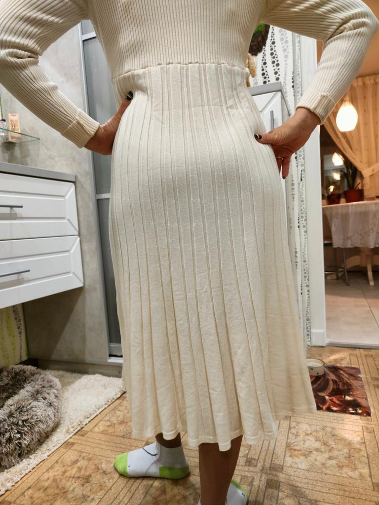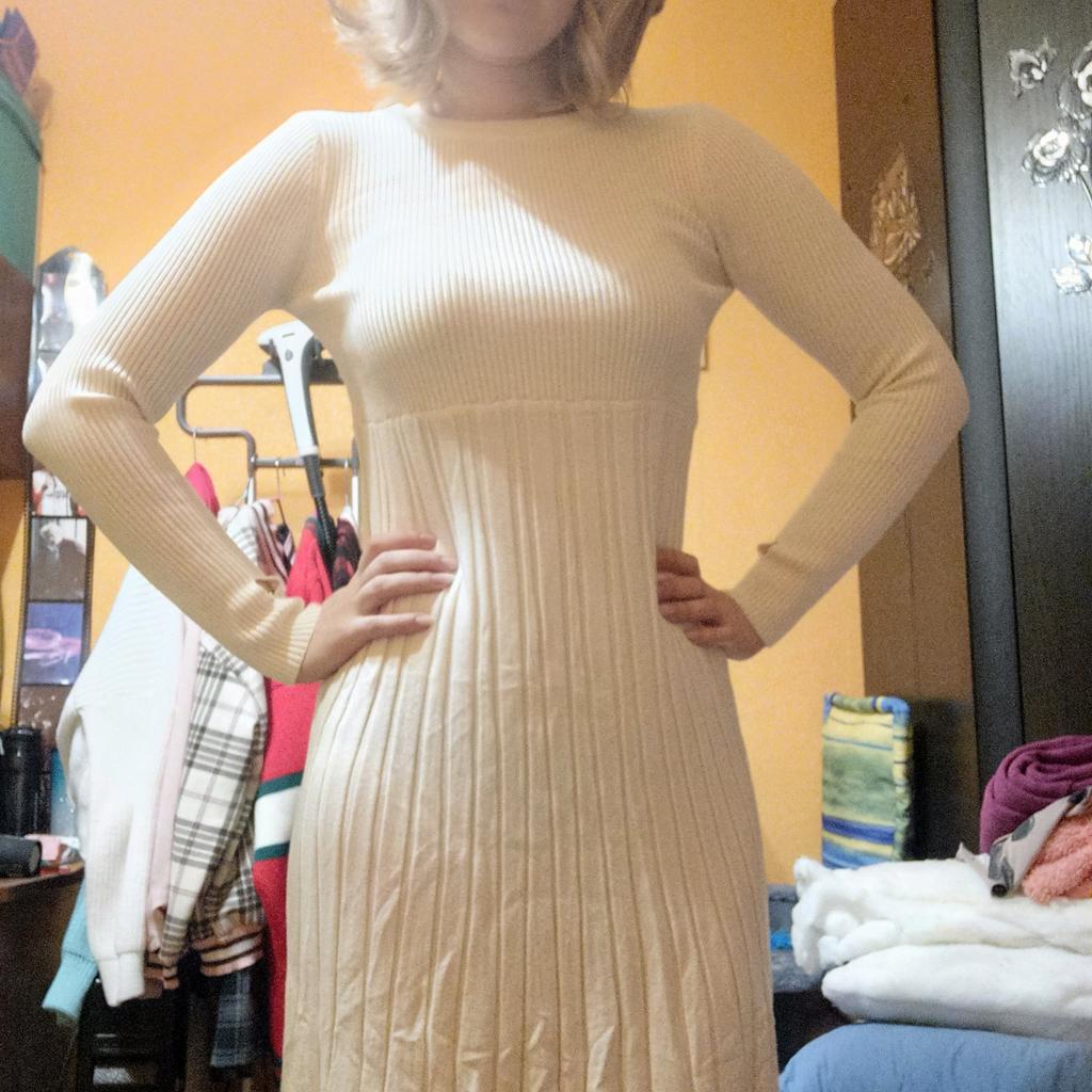 Elegantní a trendy béžové úpletové šaty 🤗💕 Miluji tento celobéžový styl!!! Šaty jsou super elegantní. Při chůzi se hravě pohybuje. Pletená látka, velmi měkká a pohodlná. Tato barva je trochu průsvitná, měla jsem si pod ní vzít dlouhý top 🤭😅.. Je univerzální. Moje míry jsou 84-66-89cm a měřím 169cm. V pase je mi trochu volná, dalo by se k ní nosit bederní pás. Látka je pružná. Rukávy mají otvory na palce, takže ruce zůstanou v zimě v teple! Objednávka dorazila za 26 dní domů spolu s bundou, kterou jsem právě zveřejnil na svém profilu. Naprosto doporučuji!! ✔️✔️