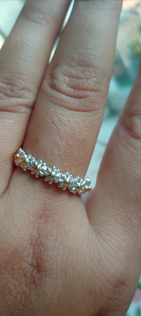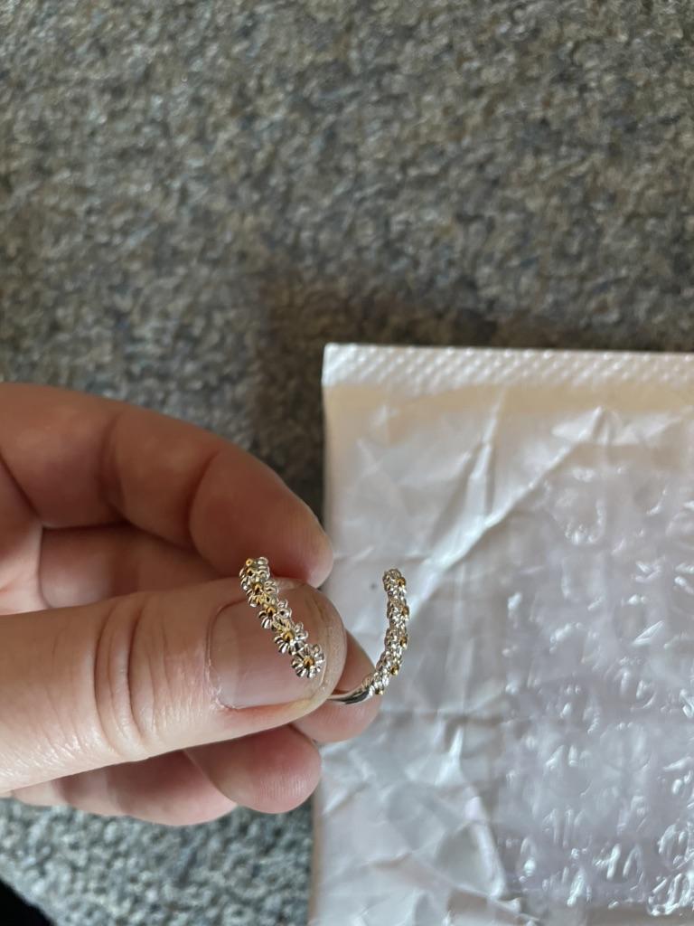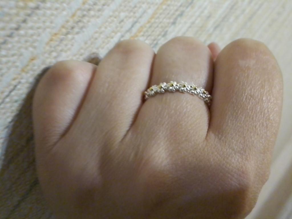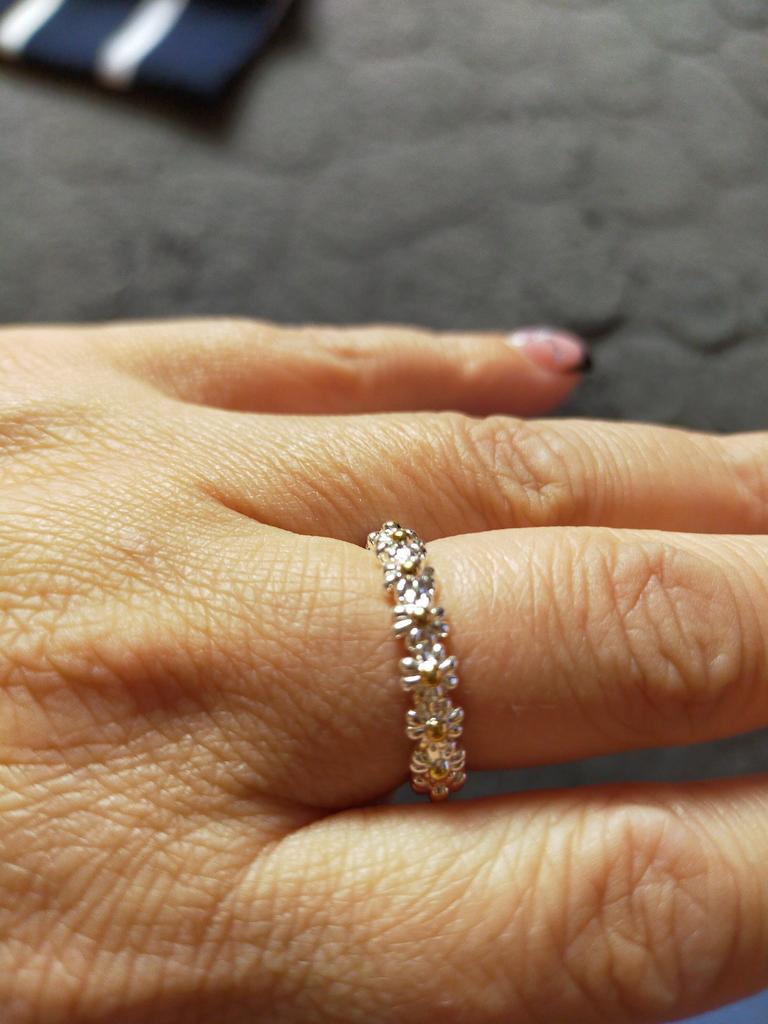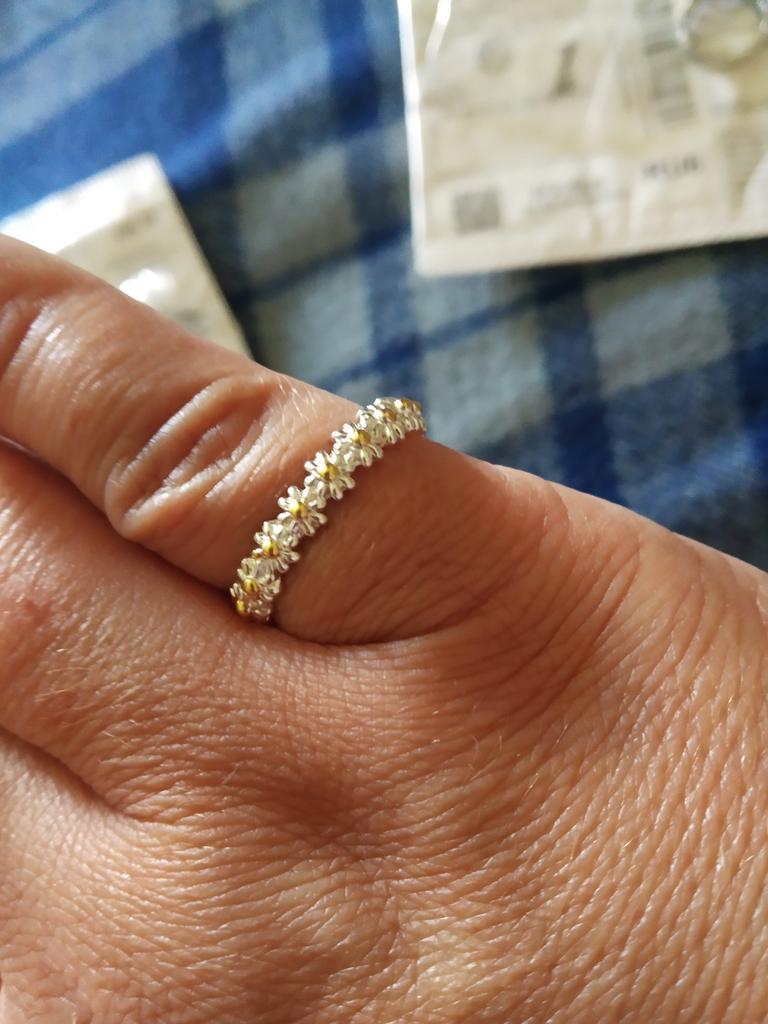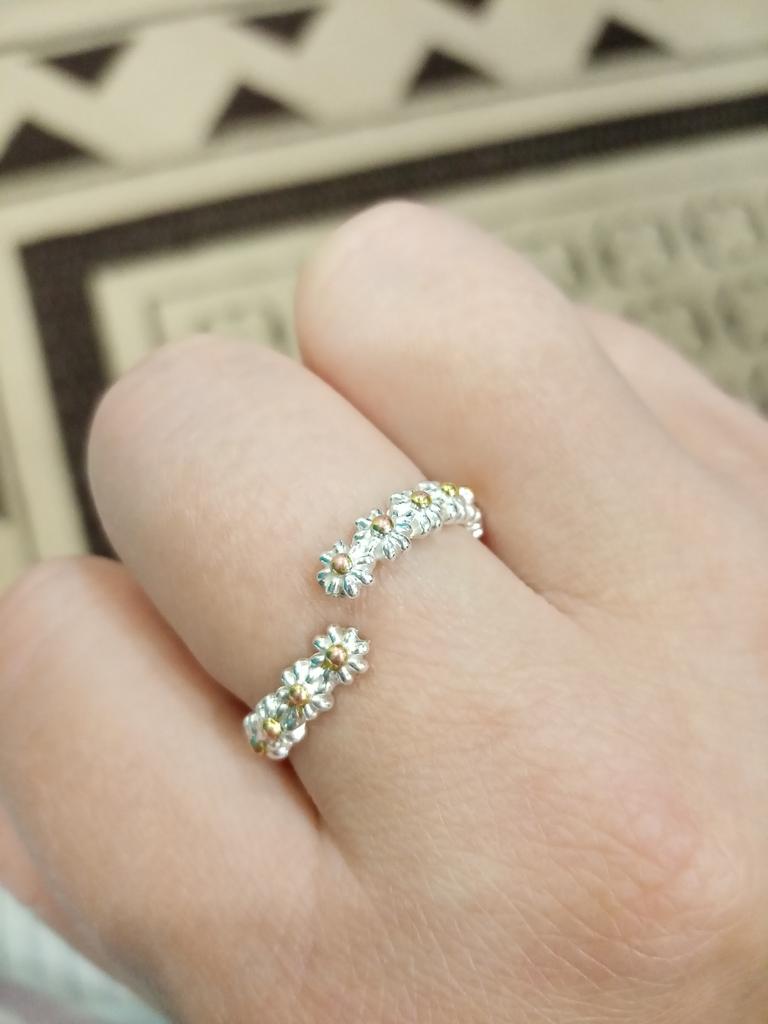 Snadno nastavitelná velikost. Prsten dobře drží upravenou velikost. Jedinou nevýhodou je, že jsem si myslel, že okvětní lístky sedmikrásky budou větší a nebudou v souladu s prstencovým rámem.