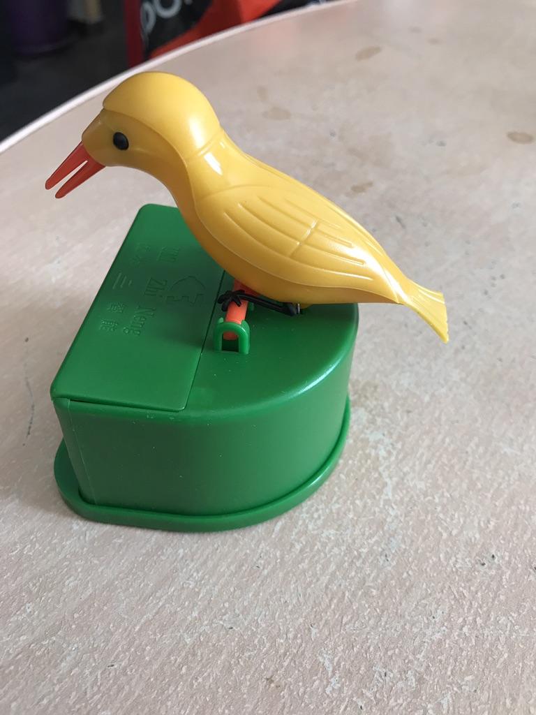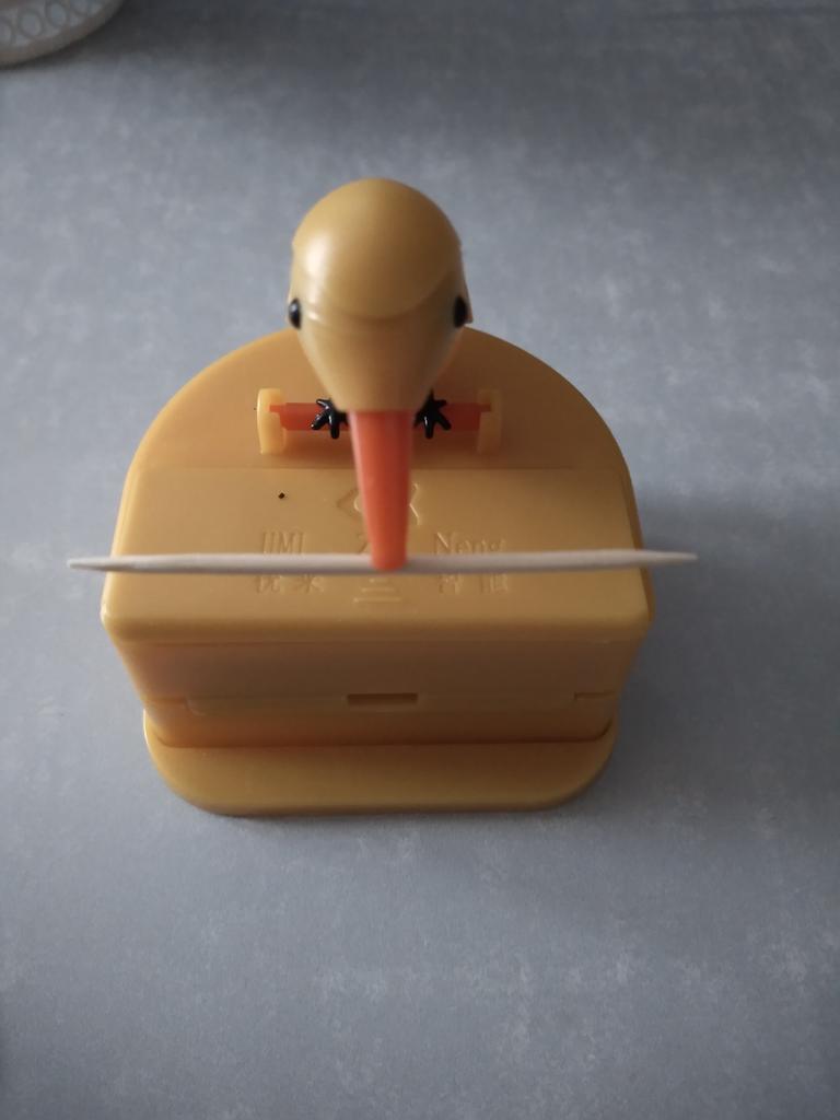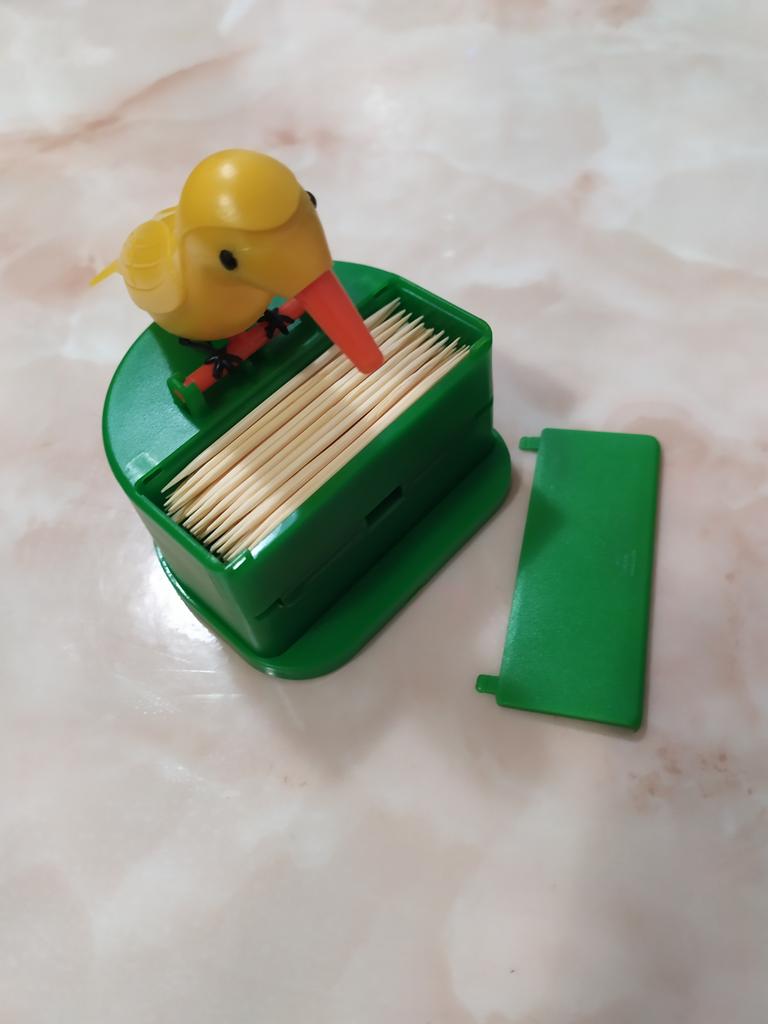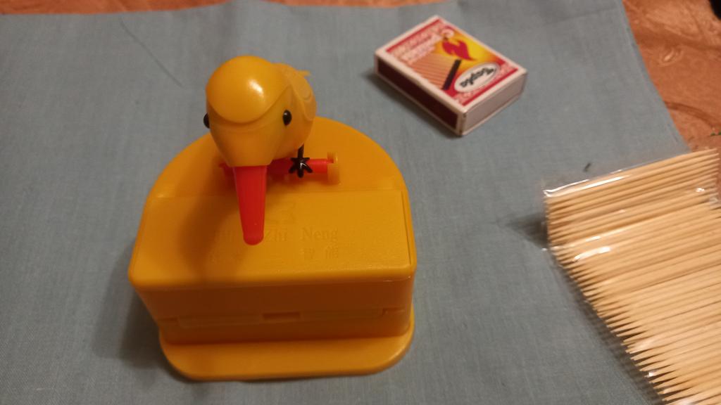 Pouzdro na párátka s ptáčkem, který při naklonění vyndává zobákem párátko.