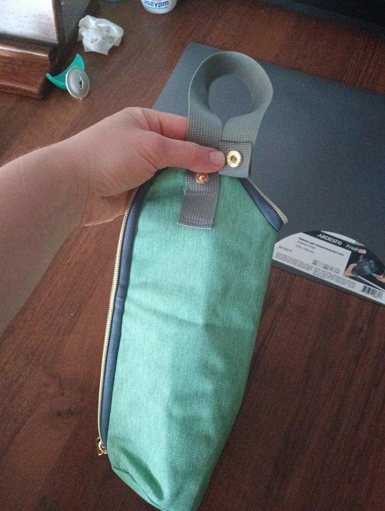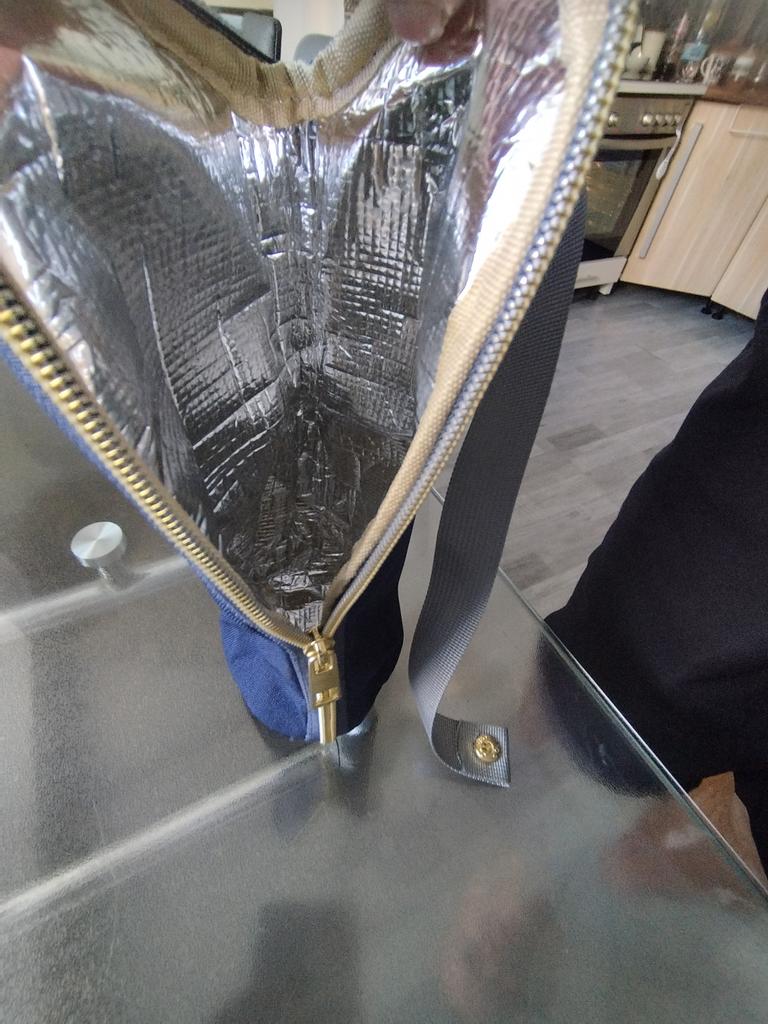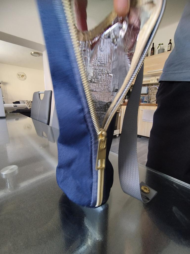 S některými vadami šití na vnější a vnitřní vrstvě, ale zip je dobře přišitý a dobře se zapíná. Zbývá otestovat, zda udrží teplo a chlad. Rukojeť lze odepnout, takže skvělé pro připevnění na batohy a auta.