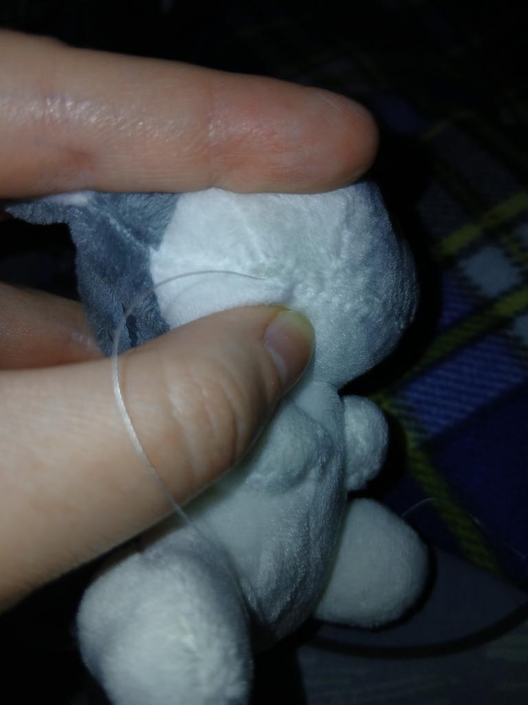Trčí dlouhatánská nitka a díra v hračce, je vidět výplň