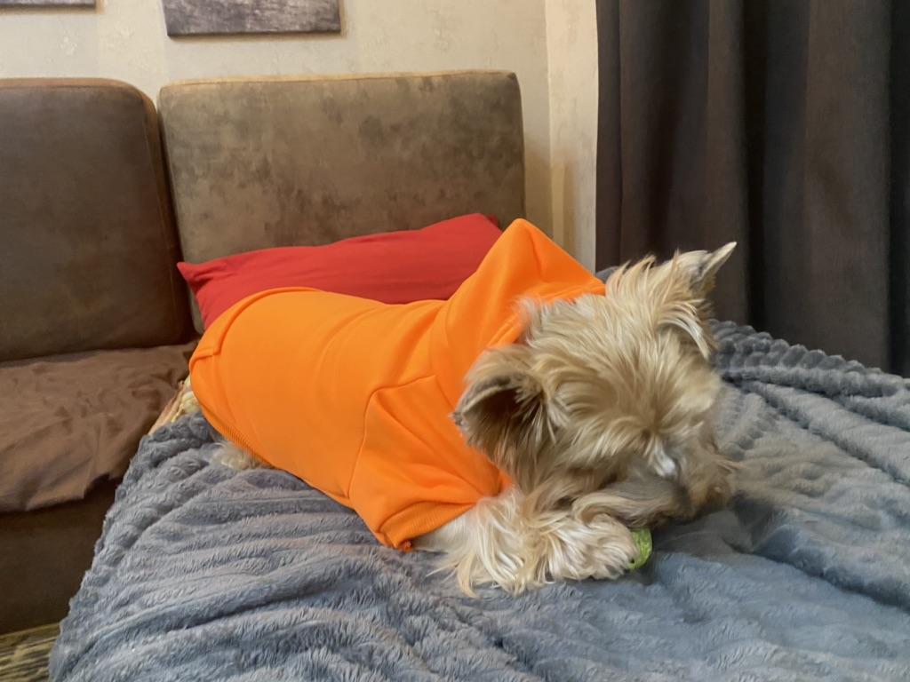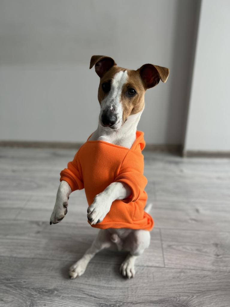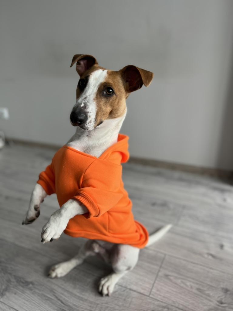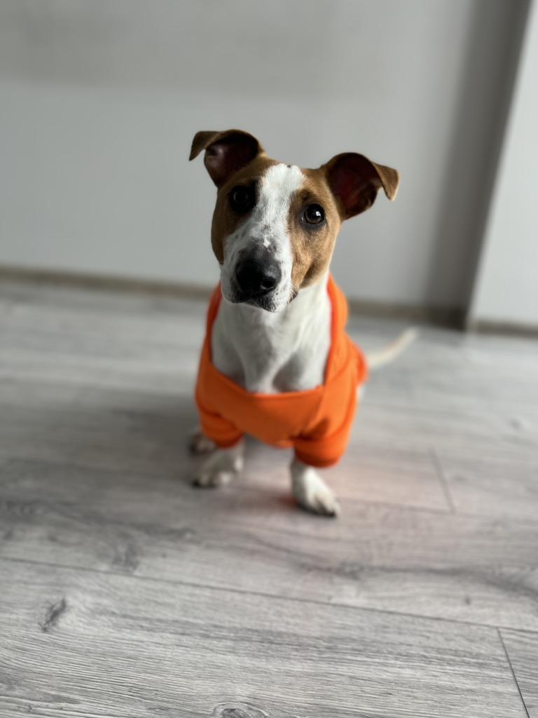 Miluju to... je to mikina pro mého malého čivava v křiklavé oranžové barvě s kapucí... moc mu to sluší... moc děkuji prodejci... a joom...