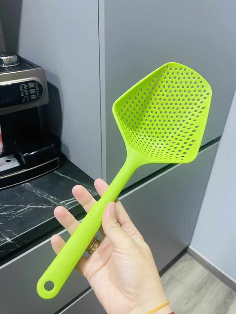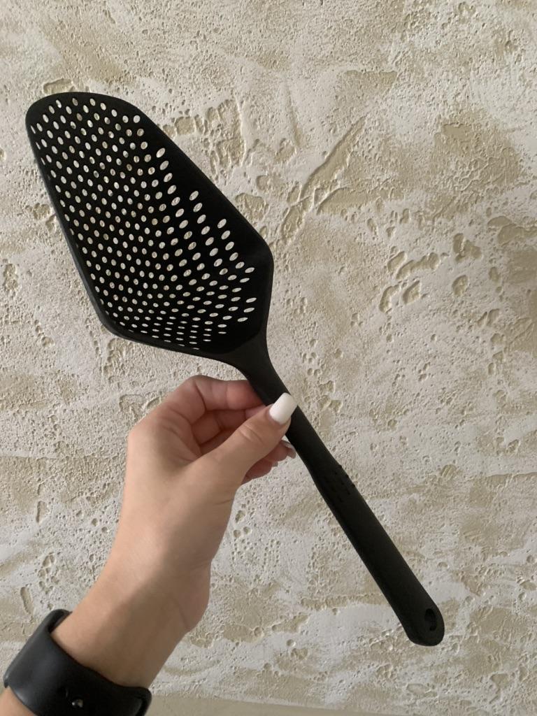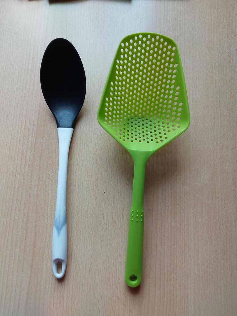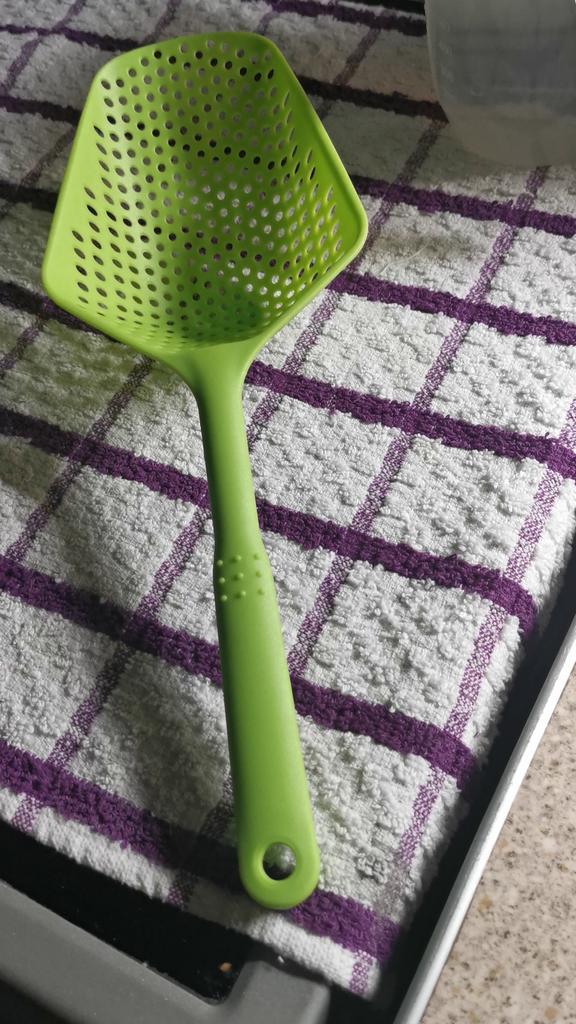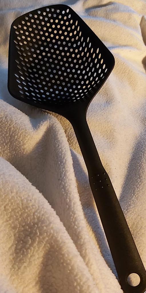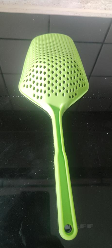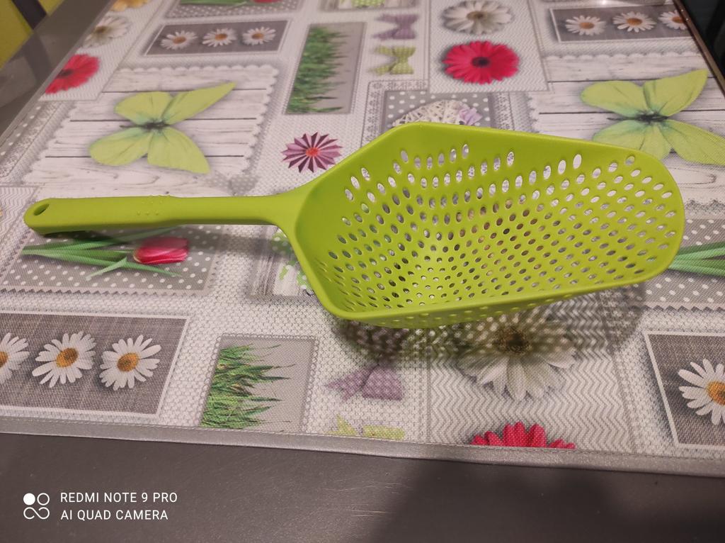 Fascinuje mě tento typ cedníkové lžíce. Je nylonová, nepřilnavá, antikorozní, odolává vysokým teplotám, je velmi velmi praktická. Ideální velikost