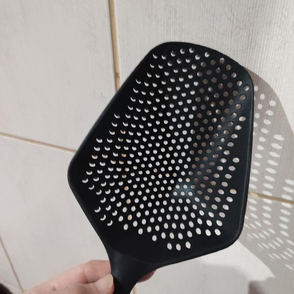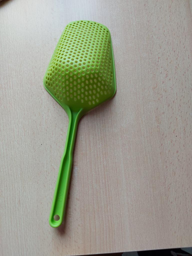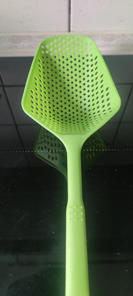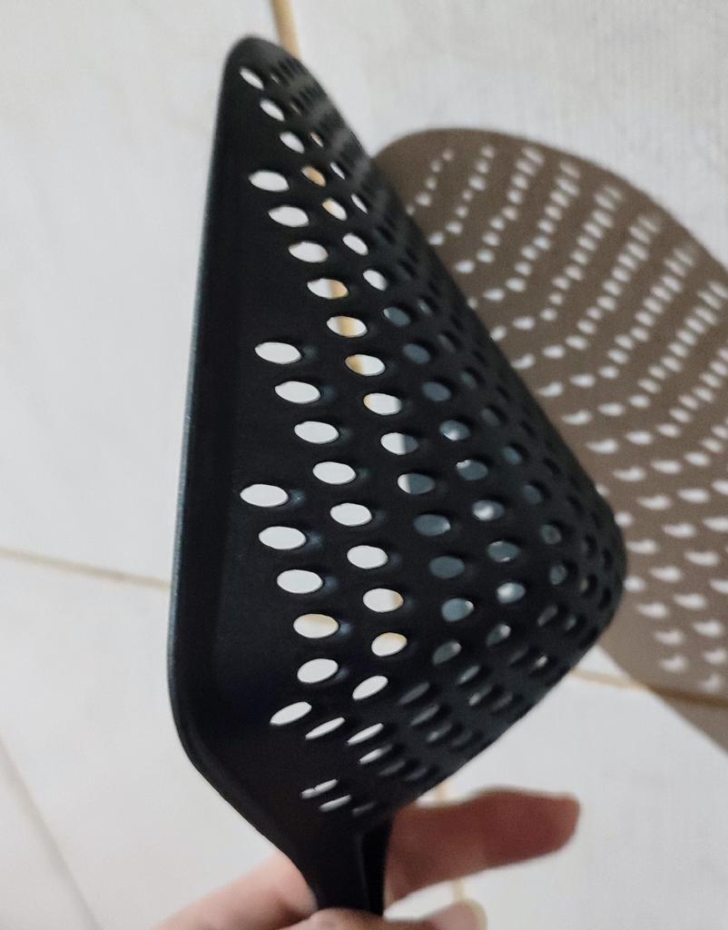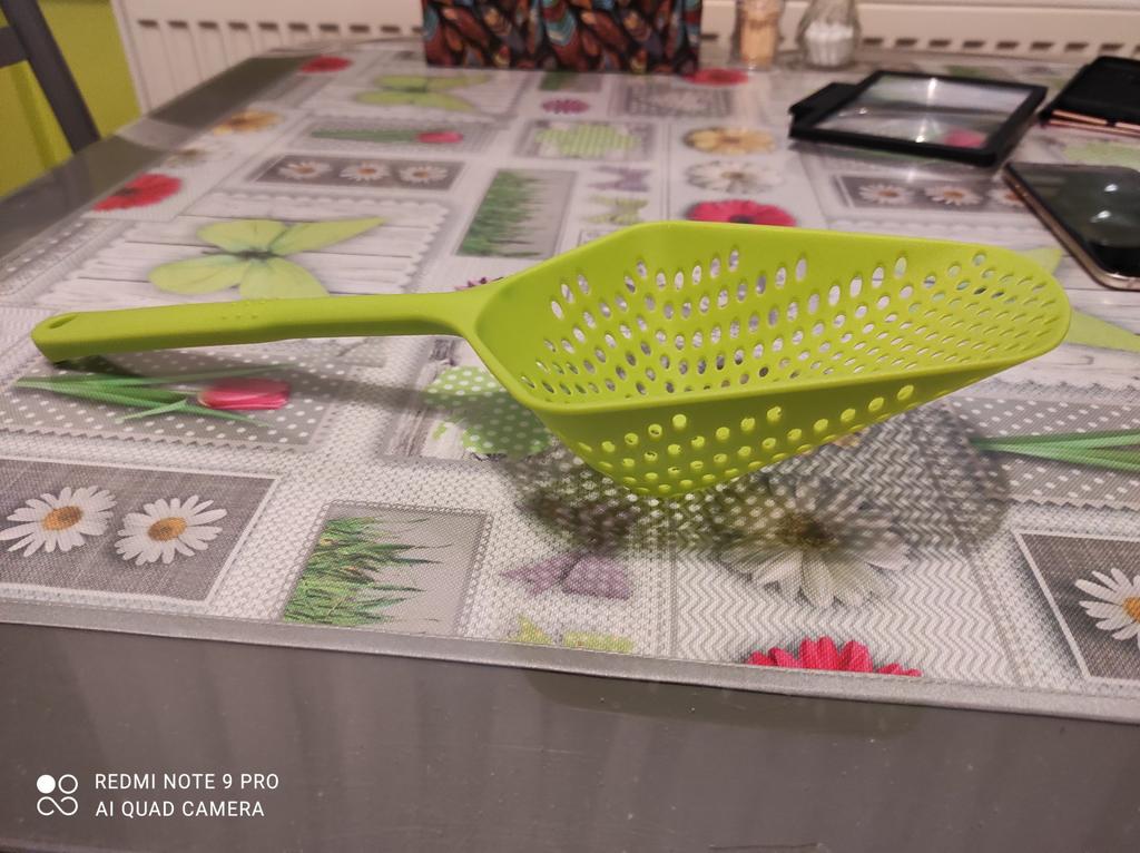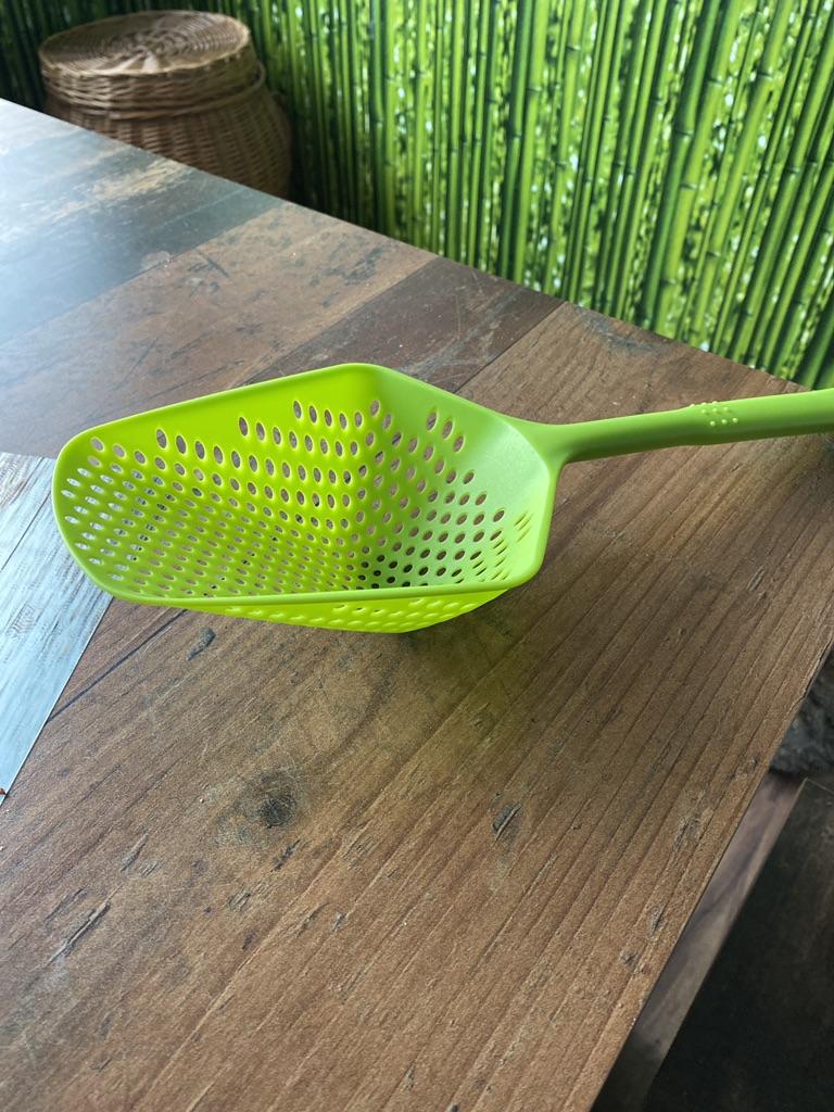 Fascinuje mě tento typ cedníkové lžíce. Je nylonová, nepřilnavá, antikorozní, odolává vysokým teplotám, je velmi velmi praktická. Ideální velikost
