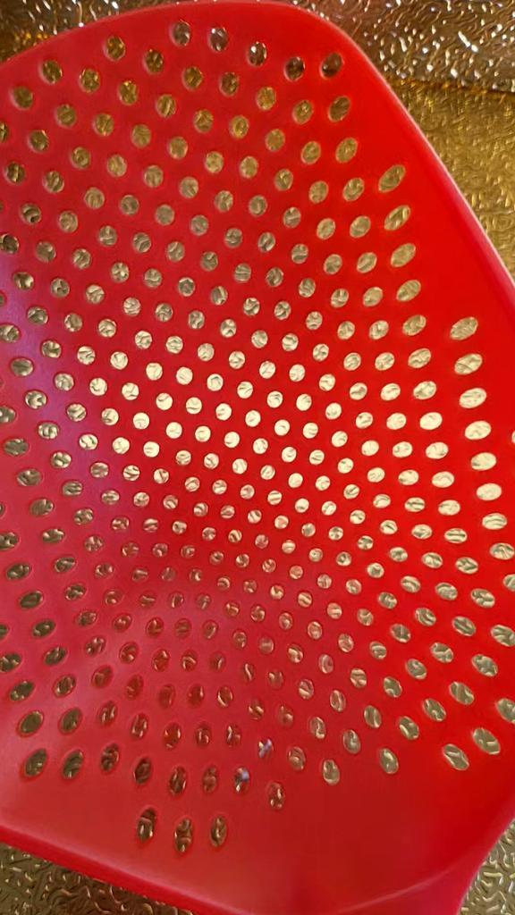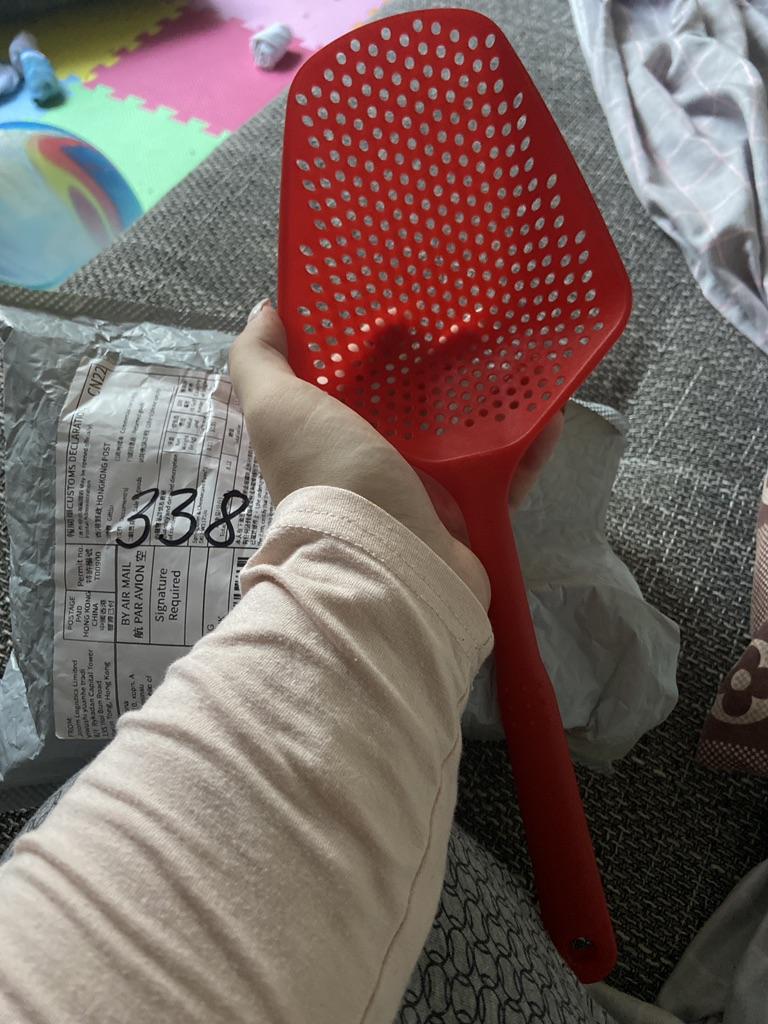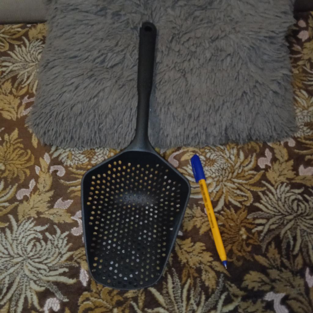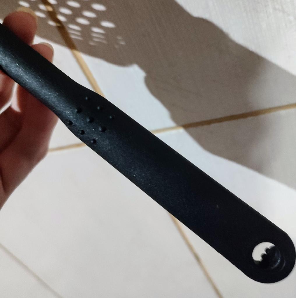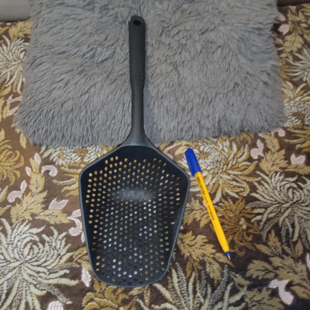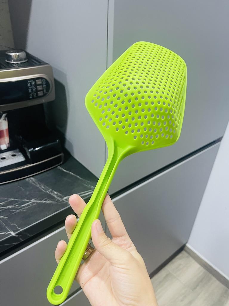 Fascinuje mě tento typ cedníkové lžíce. Je nylonová, nepřilnavá, antikorozní, odolává vysokým teplotám, je velmi velmi praktická. Ideální velikost
