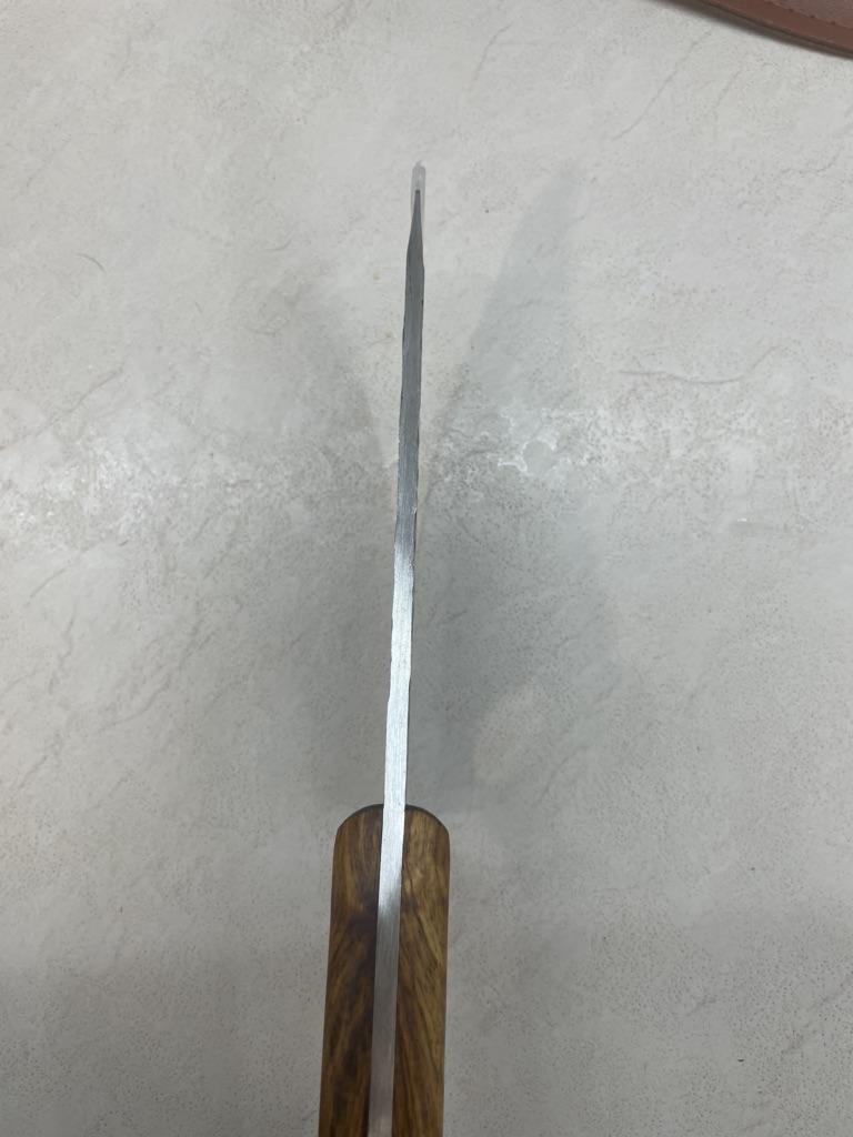 Nůž vypadá na první pohled dobře, ale při bližším prozkoumání není dobře zpracovaná rukojeť. Dřevěné rukojeti jsou příliš úzké a tři nýty ve dřevě nejsou úhledně zpracované.