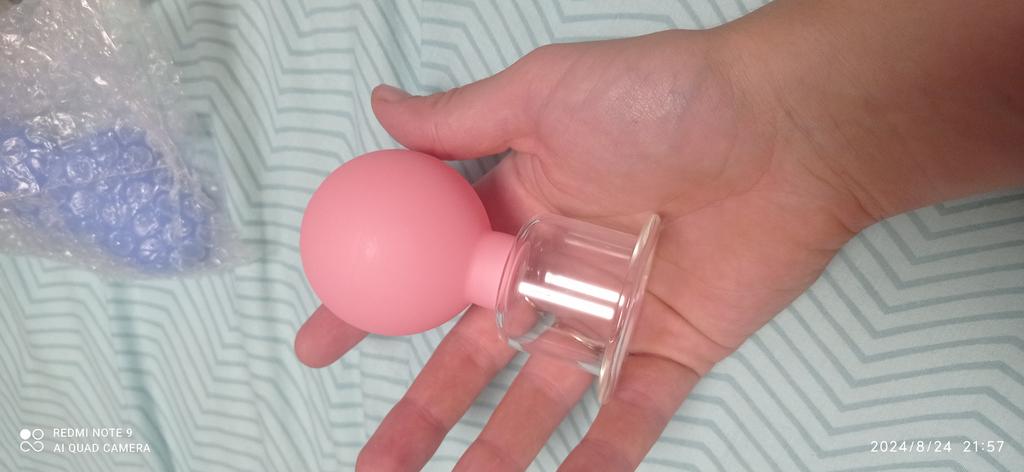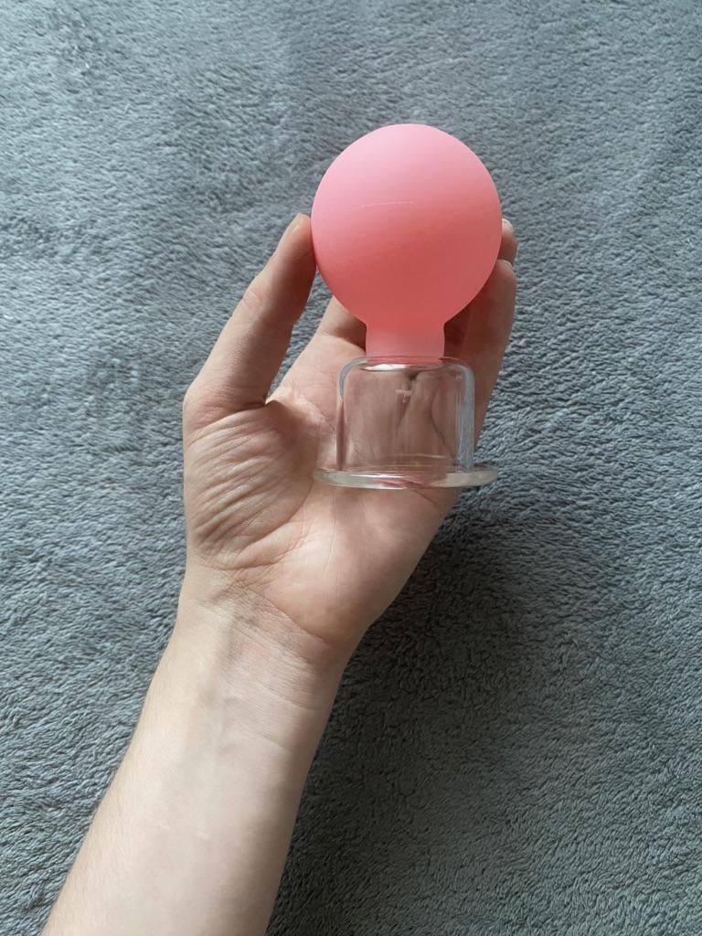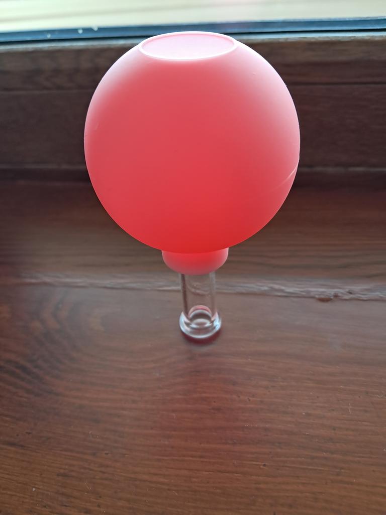 Vakuová nádoba pro masáž obličeje. Průměr skleněného otvoru je 1 cm.