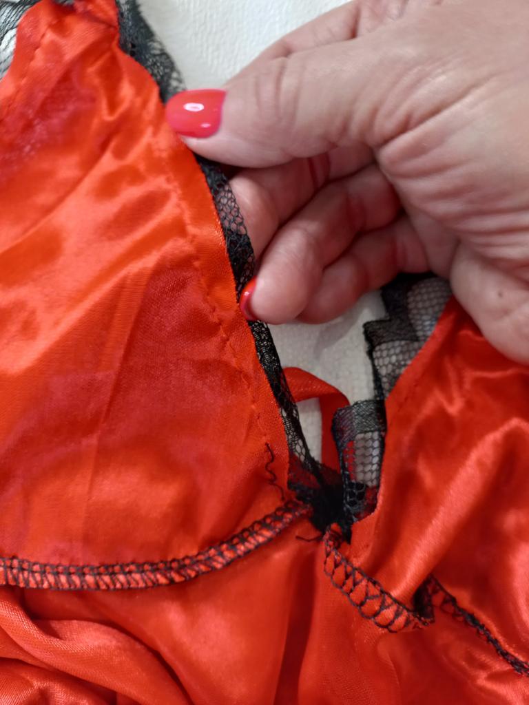 Látka je nepříjemná, elektrizuje a klouže. Malé a ze zadní strany nejsou žádné normální smyčky, kterými by se provlékala nit, jsou zde velmi malá smyčky. Krajka, která by měla být na hrudi, je příliš vysoká. Ukazuje se, že prsa jsou pokryta krajkou a vypadají strašně.