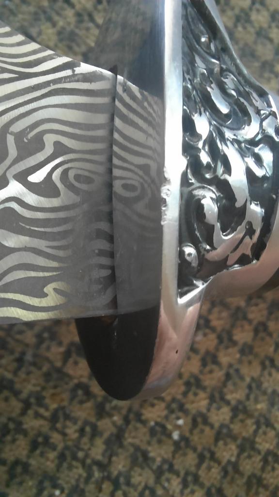 Měkký kov na nůž. Pokud dojde k cílenému nárazu rohem koncového dílu na roh koncového dílu běžného kuchyňského nože z obchodu, zůstane značka promáčknutím pouze na tomto noži, nikoli stopou na kuchyňském noži. Jednoduchý test, který určí, která ocel je tvrdší. Ale výrobek je krásný.