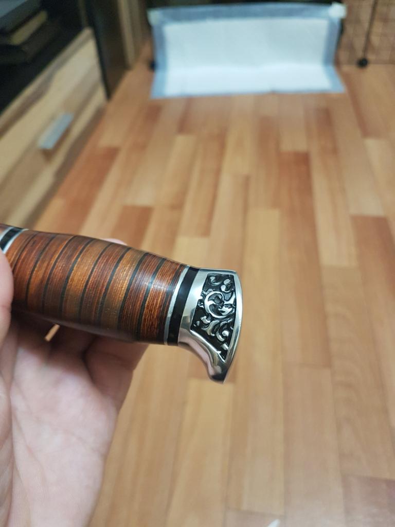 Silný, těžký nůž. Vzal jsem to do kuchyně. Ale v kuchyni to není moc dobré. Tloušťka pažby je 4 mm.