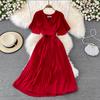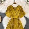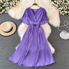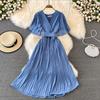 Midi retro šaty dámské jednobarevné, výstřih do V, šněrování pas, tenké midi plisované šaty Office Lady