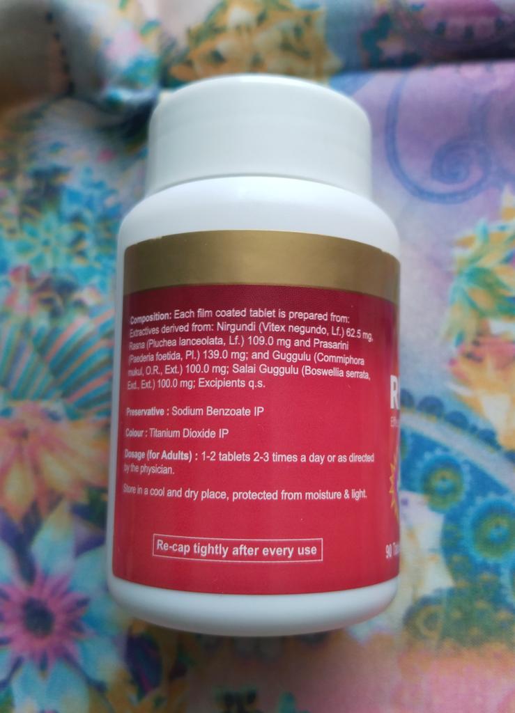 Прутняк китайский (Vitex negundo Lf.) - 62.5 мг, Плюхея остролистная (Pluchea lanceolata Lf.) - 109.0 мг, Паэдерия пахучая (Paederia foetida Pl.) - 139.0 мг, Экстракт коммифоры мукул (Commiphora mukul O.R. Ext.) - 100.0 мг, Экстракт босвеллии пильчатой (Boswellia serrata Exd. Ext.) - 100.0 мг.