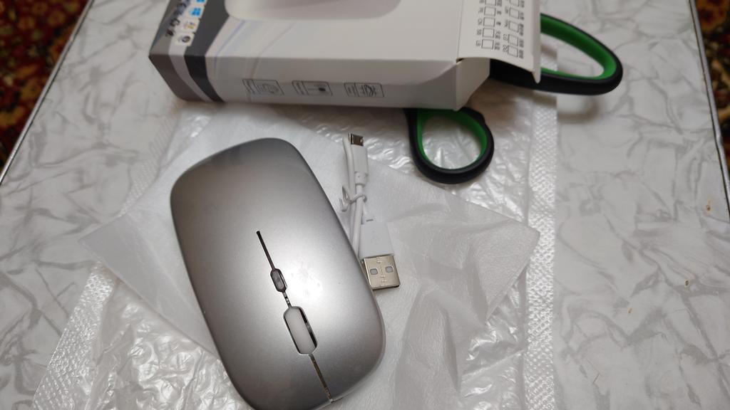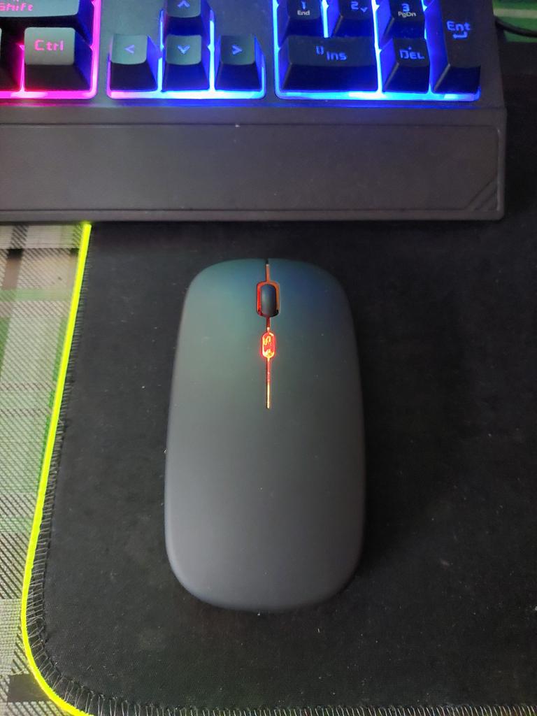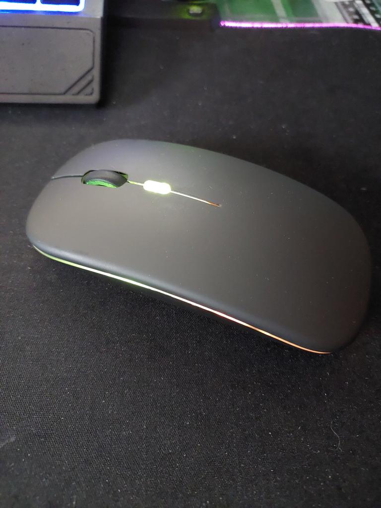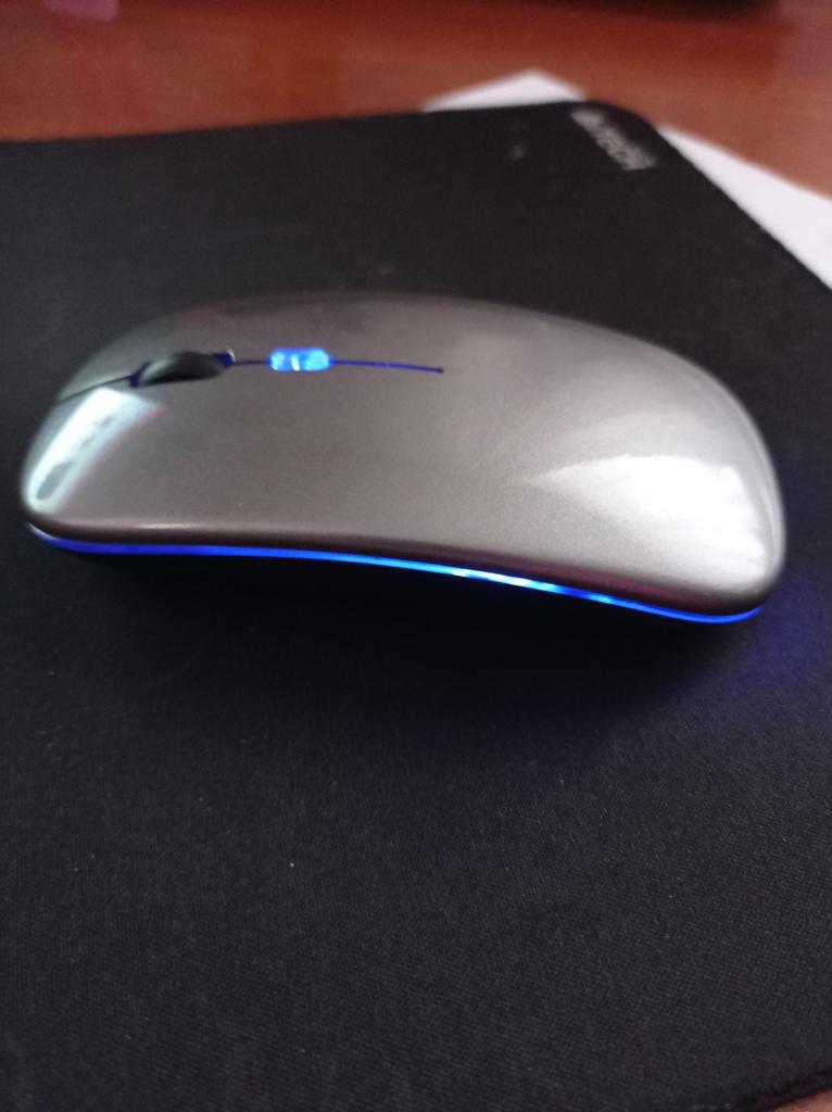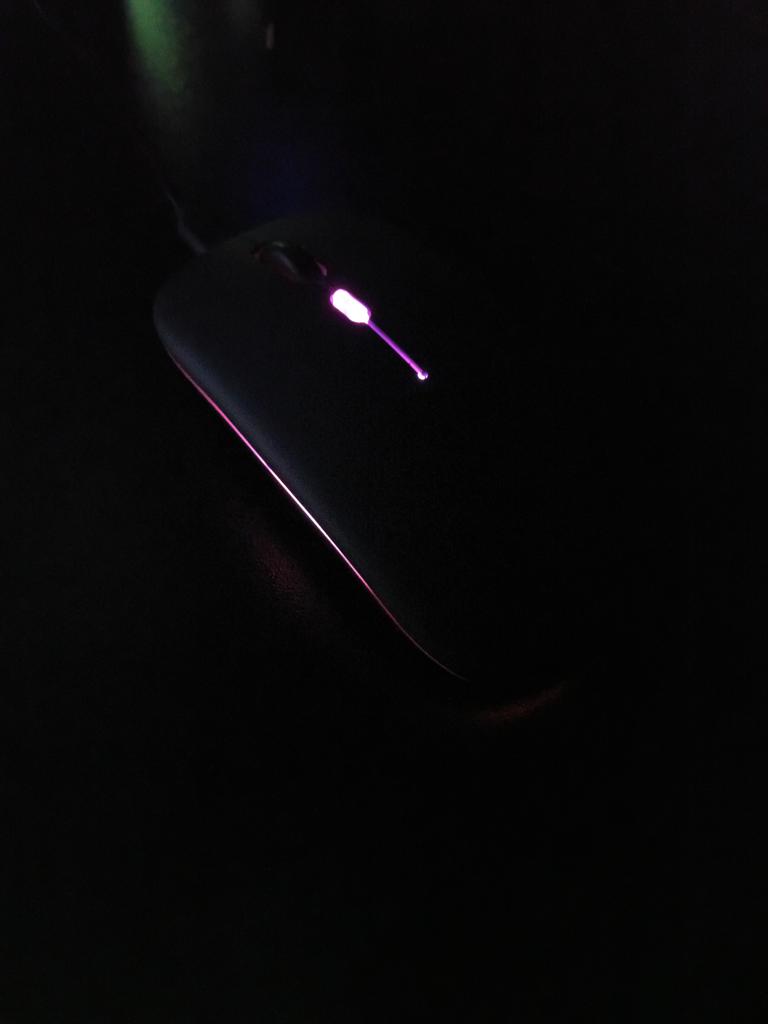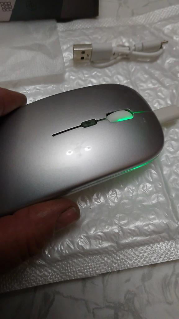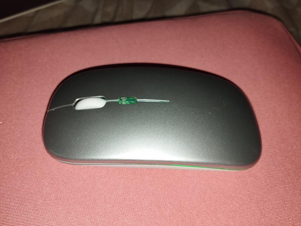 Moje dcera používá tuto myš 2 roky, žádné stížnosti, dala mé vnučce notebook, pak přidala velmi dobrou myš. Bluetooth adaptér a vestavěná baterie. Součástí je krátký nabíjecí kabel. Během nabíjení svítí zeleně (na obrázku) a během provozu mění barvy. Dobrá myš (pohodlná) a za takovou cenu