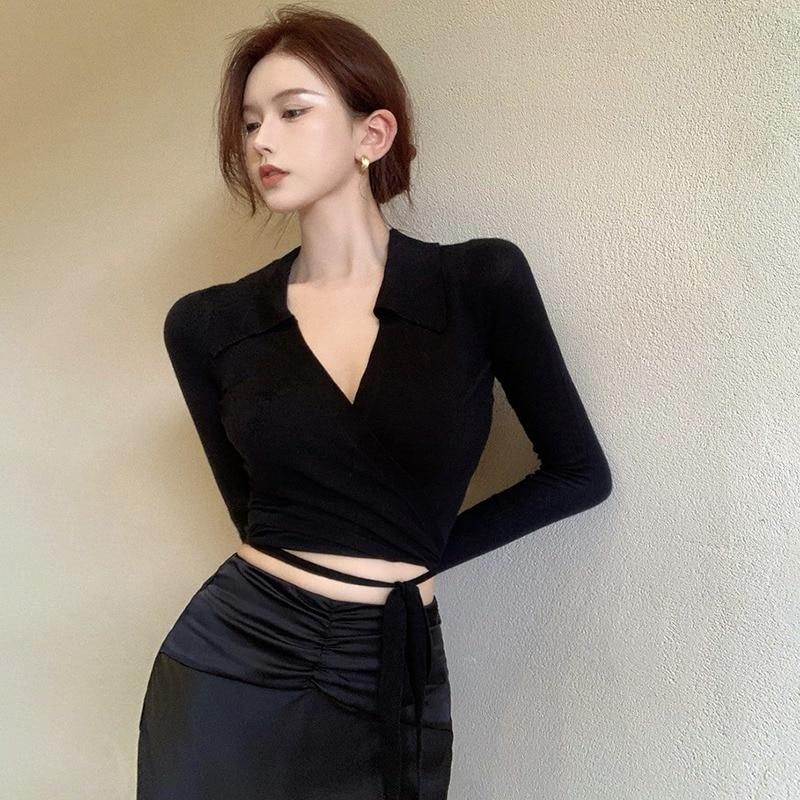 Women Pullovers Tops Waist Cross Bandage Solid Color Long Sleeve Tops V-Neck Spring Autumn