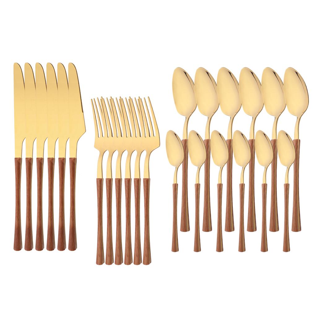 COMFORTABLE WOOD TEXTURE HANDLE] - The vintage silverware is designed with an imitated wood grain handle, concise and retro, and the smooth edges and curves make it easy to handle and grip, and the shiny gold and wood colors create a rustic but stylish atmosphere, which can match up well with your existing furniture.
