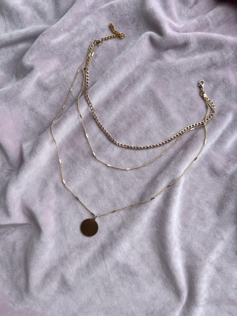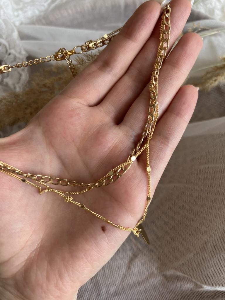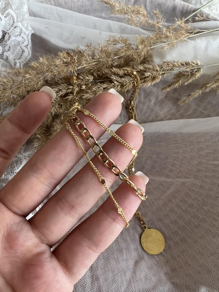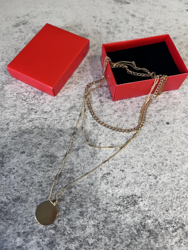 Krásný vrstvený náhrdelník ve zlatém provedení. Skládá se ze 3 náhrdelníků spojených humrovou sponou, má i řetízkový prodlužovací řetízek. Přijel za 2 týdny do Irska, prodejce přidal dárek a prezentační krabičku. Příjemné nakupování!
