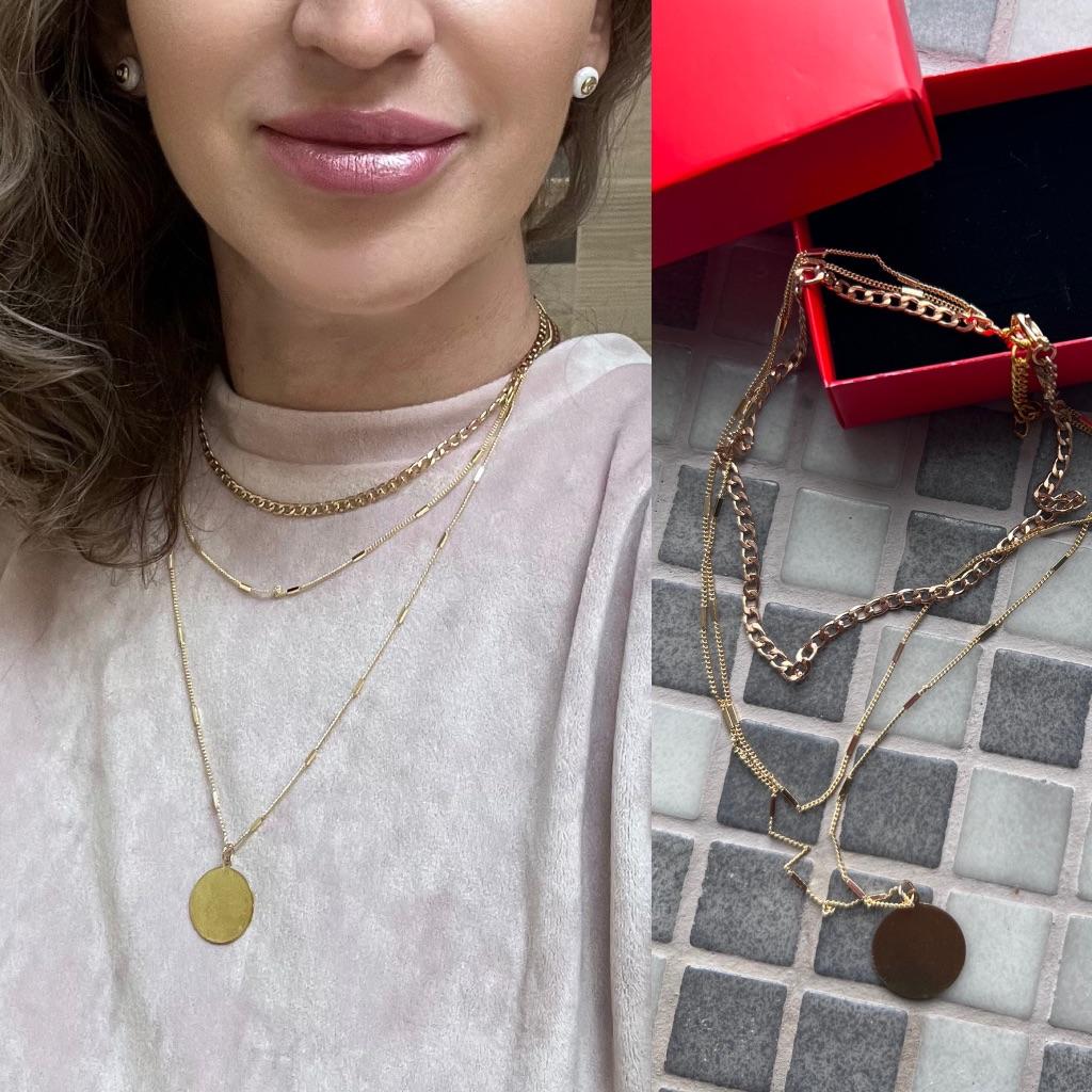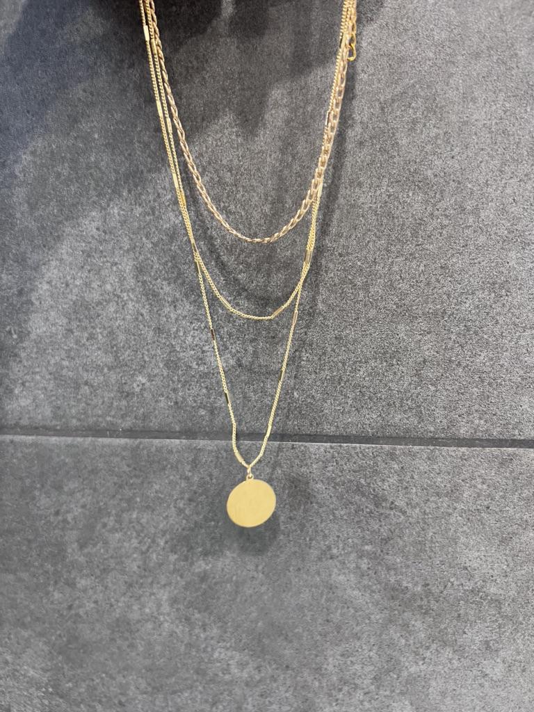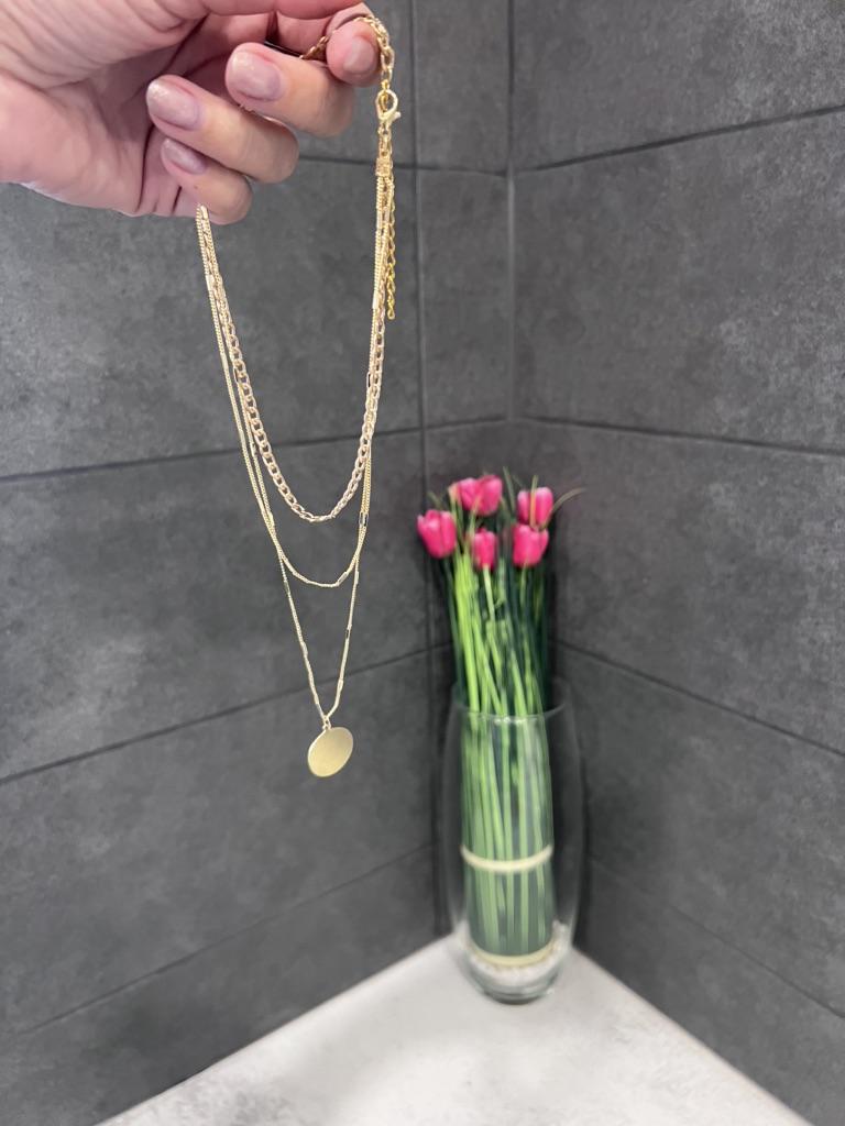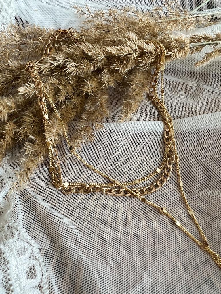 Krásný vrstvený náhrdelník ve zlatém provedení. Skládá se ze 3 náhrdelníků spojených humrovou sponou, má i řetízkový prodlužovací řetízek. Přijel za 2 týdny do Irska, prodejce přidal dárek a prezentační krabičku. Příjemné nakupování!