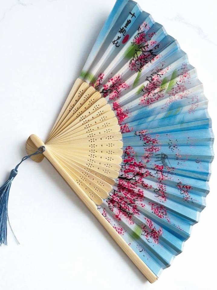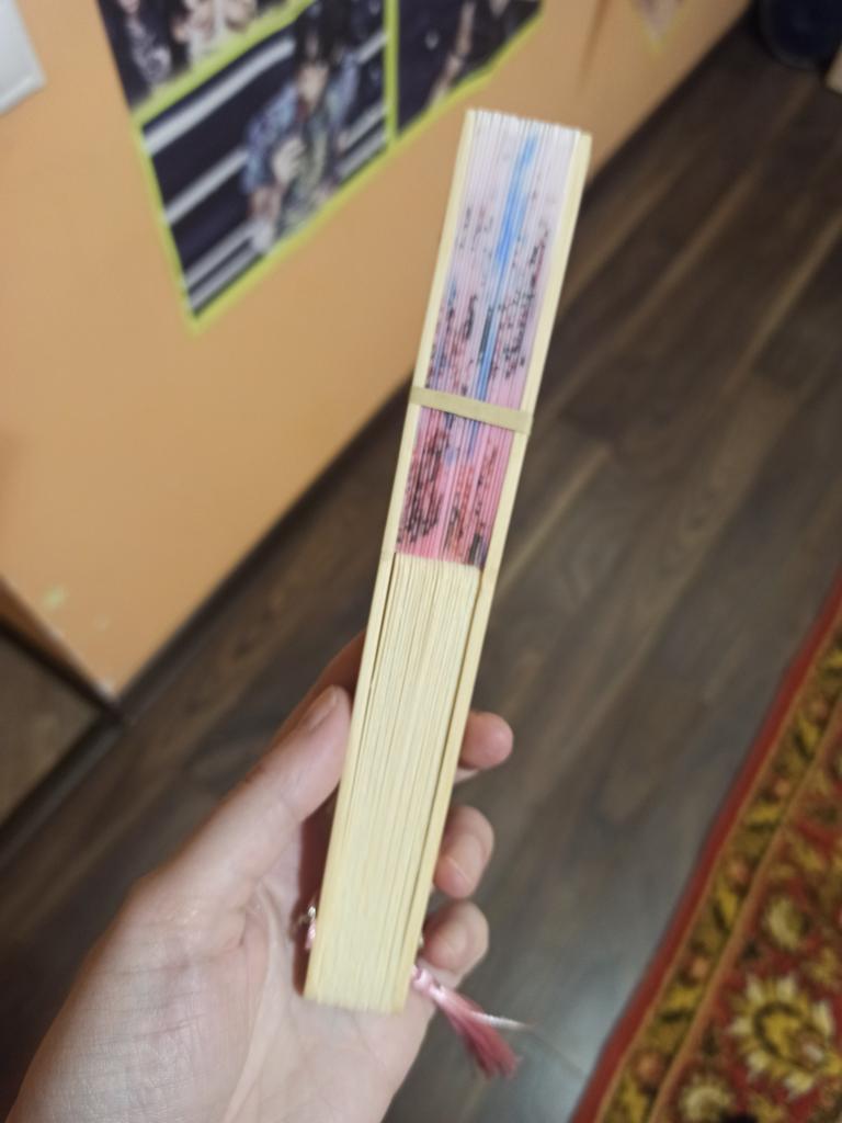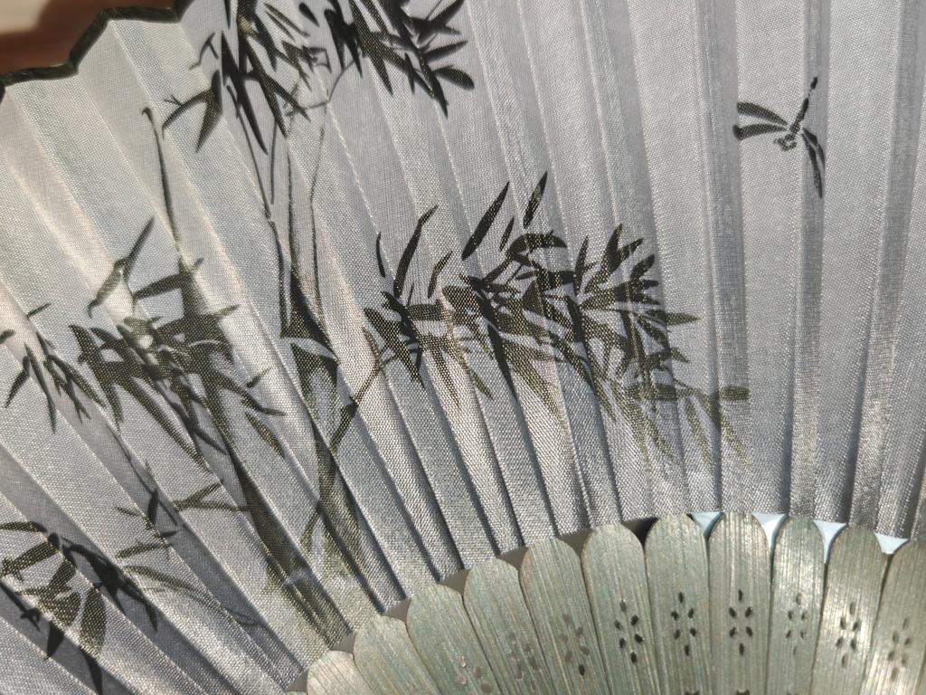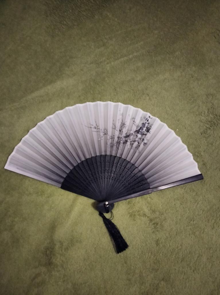 Pozadí obrázku má úplně jiný odstín než na obrázku, samotná větvička s tím pozadím velmi splývá, květy jsou spíše šedé než bílé. Když jsem poprvé vzala vějíř do ruky, zadřela jsem si třísku. Některé tyčinky na okrajích trčí, z nich vyčnívají malé kousky dřeva tlusté jako vlas a píchají do rukou jako jehly. Některé tyčinky mají jakýsi bílý povlak.
