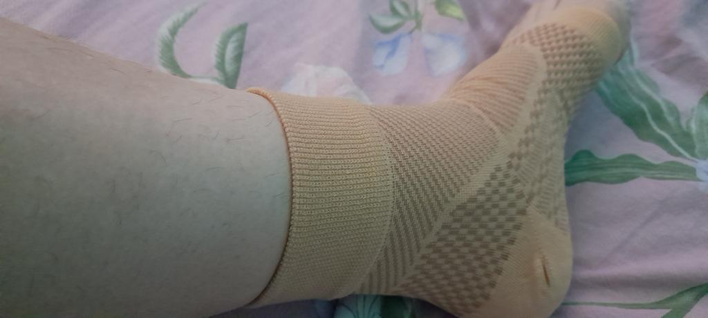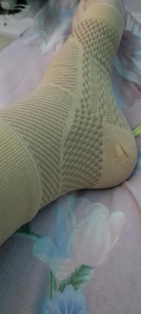 Nosím ho už 4 hodiny, je dobrý, kloub zafixovaný, tenký, noha se nepotí, gumičky netěsní.