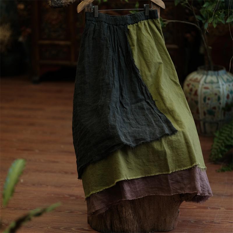 Johnature Dámské Vintage patchworkové plátěné sukně Pružný pas Oblečení Jaro Ležérní Ženy Volné A-Line sukně