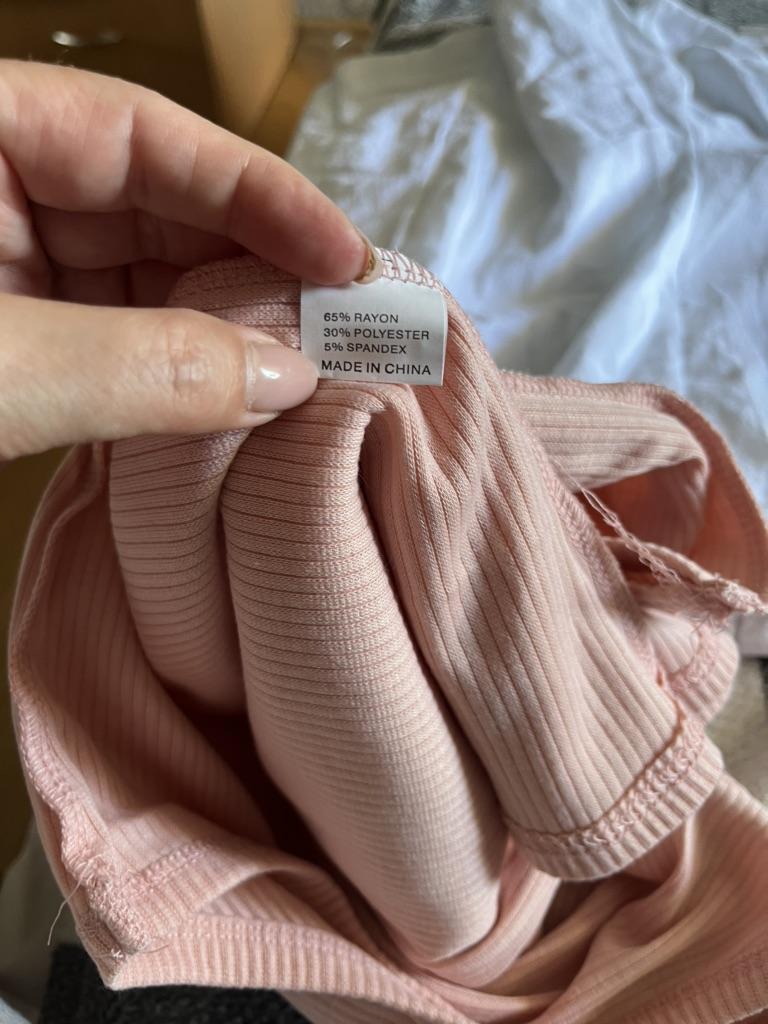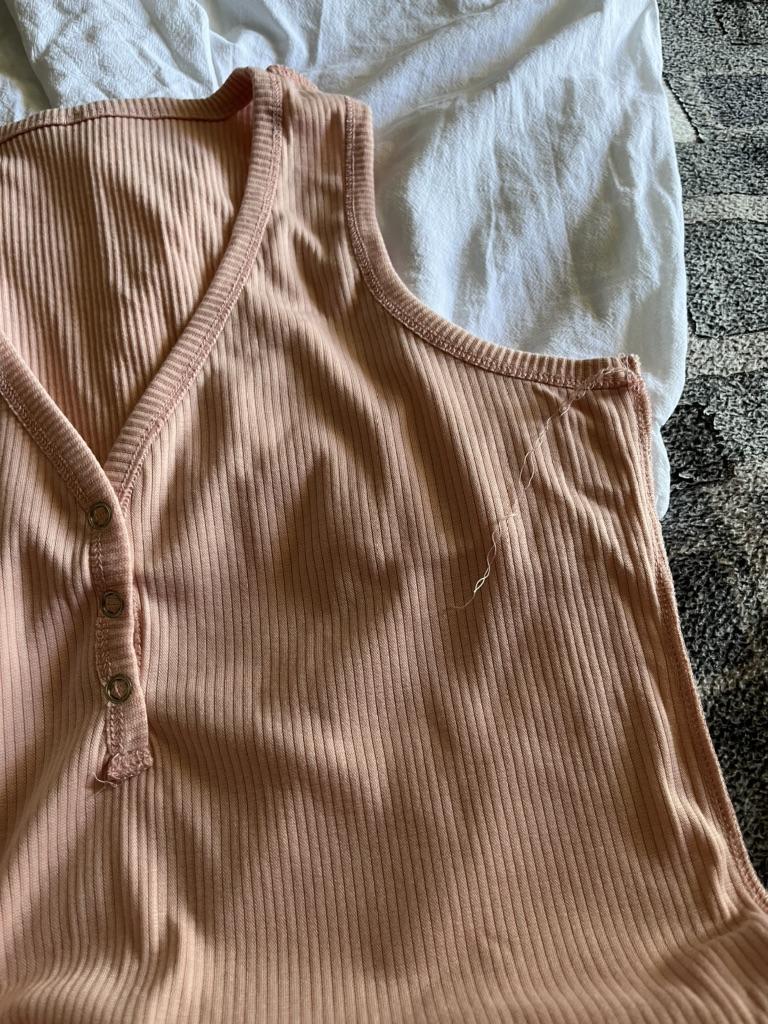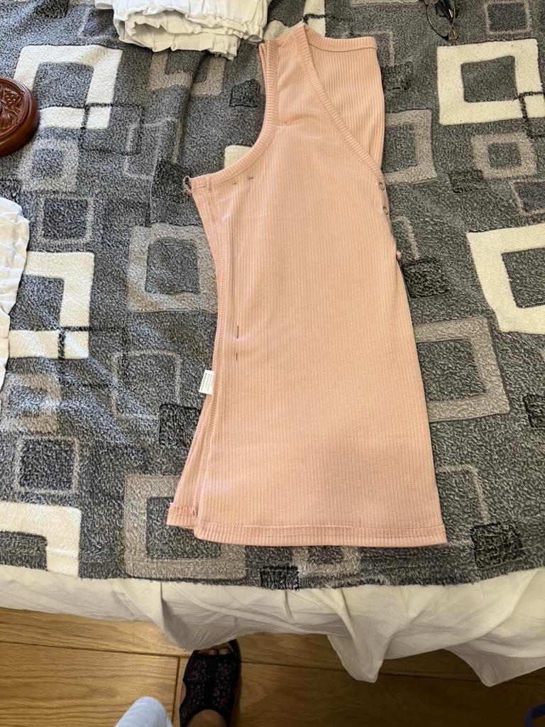 Barva je špinavě fialová, látka vypadá jako žebra, ale je tekutá a nedrží tvar. Střih je vepředu zvláštní, trčí dopředu a v pase se vzadu nabírá do řasení.
