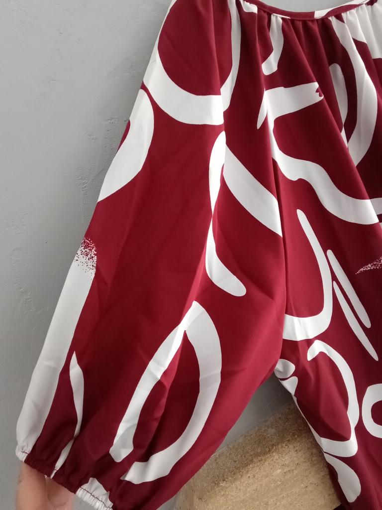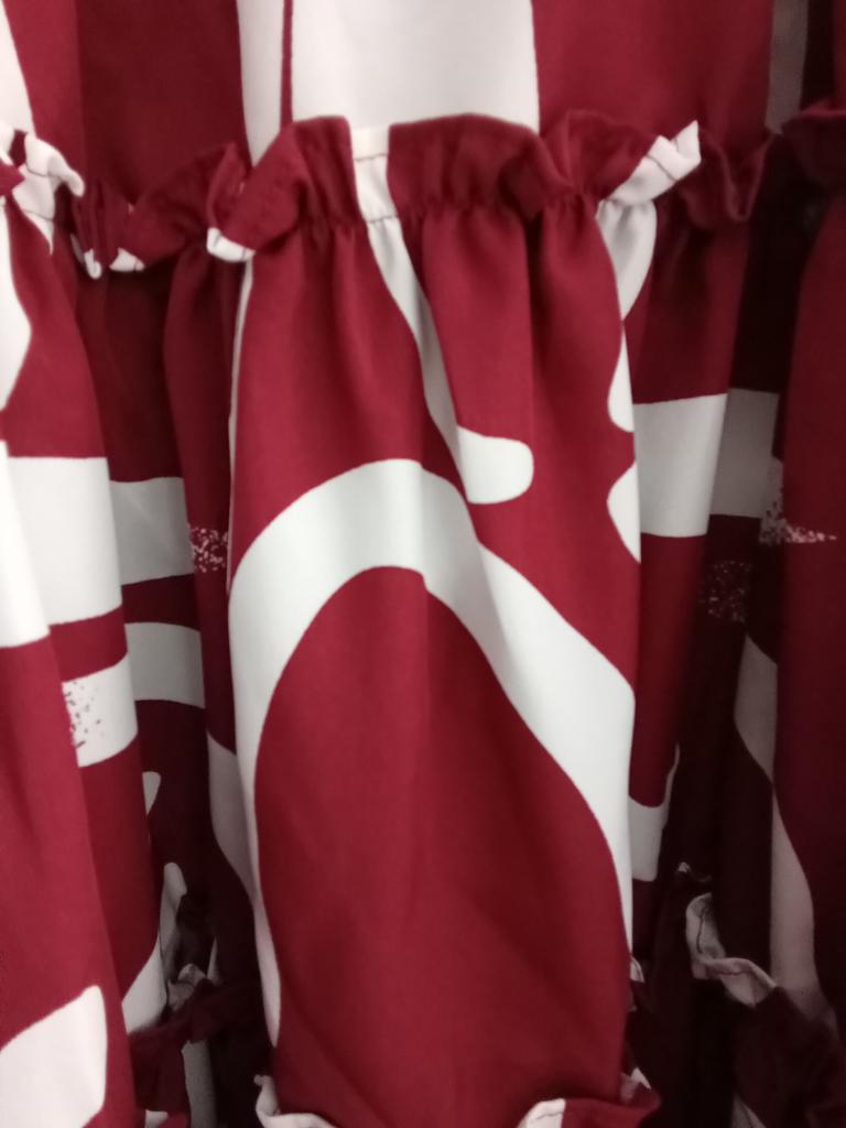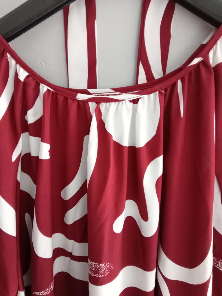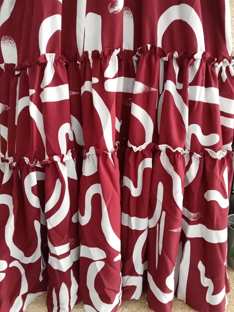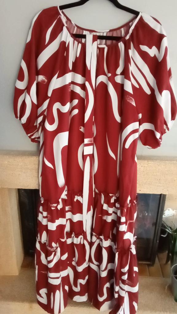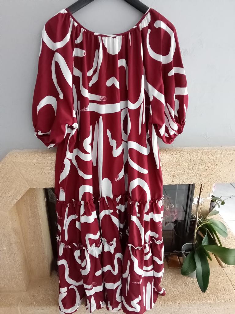 Velmi pěkné šaty do půli lýtek, mírně rozšířené. 👍💝 Barva není červená, ale spíše granátová nebo vínová. Ach. 🥴🥹 Není zde žádný štítek označující texturu, ale jedná se o polyester. 🙏🥳