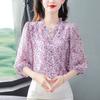 Dámská šifonová košile s květinovým potiskem, letní novinka s tříčtvrtečním rukávem, módní volný top s výstřihem do V, M-5XL