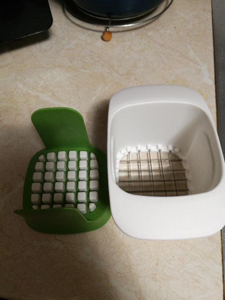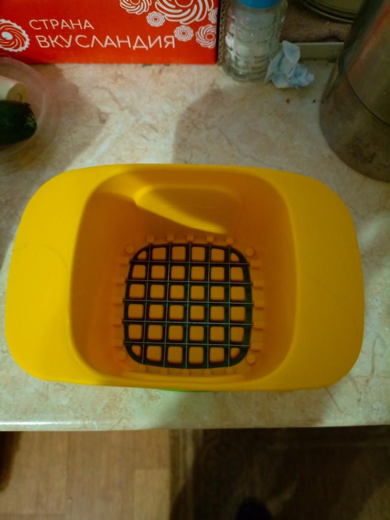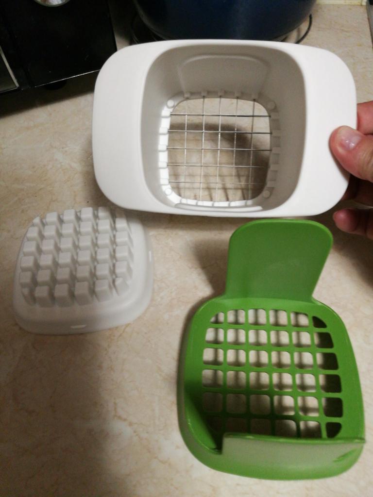 Zajímavé zařízení. Okurku, cibuli, ředkvičky a cuketu nakrájím na kostičky. Všechno je skvělé. Vařené vejce jsem vůbec nekrájel na velkou kostku (!) - bylo rozdrcené a nože byly ve vejci všechny špinavé, že je myčka nemohla umýt! Moje oblíbená část bylo krájení nových brambor hranolkem na smažení. Je to snadné a rychlé.))