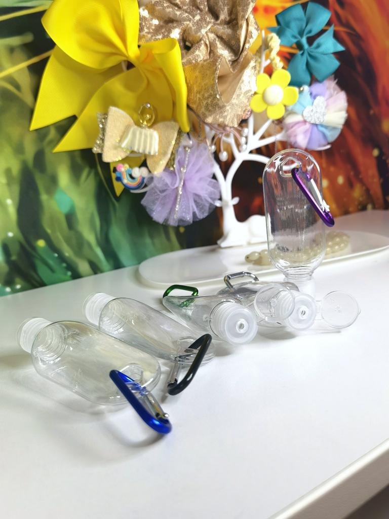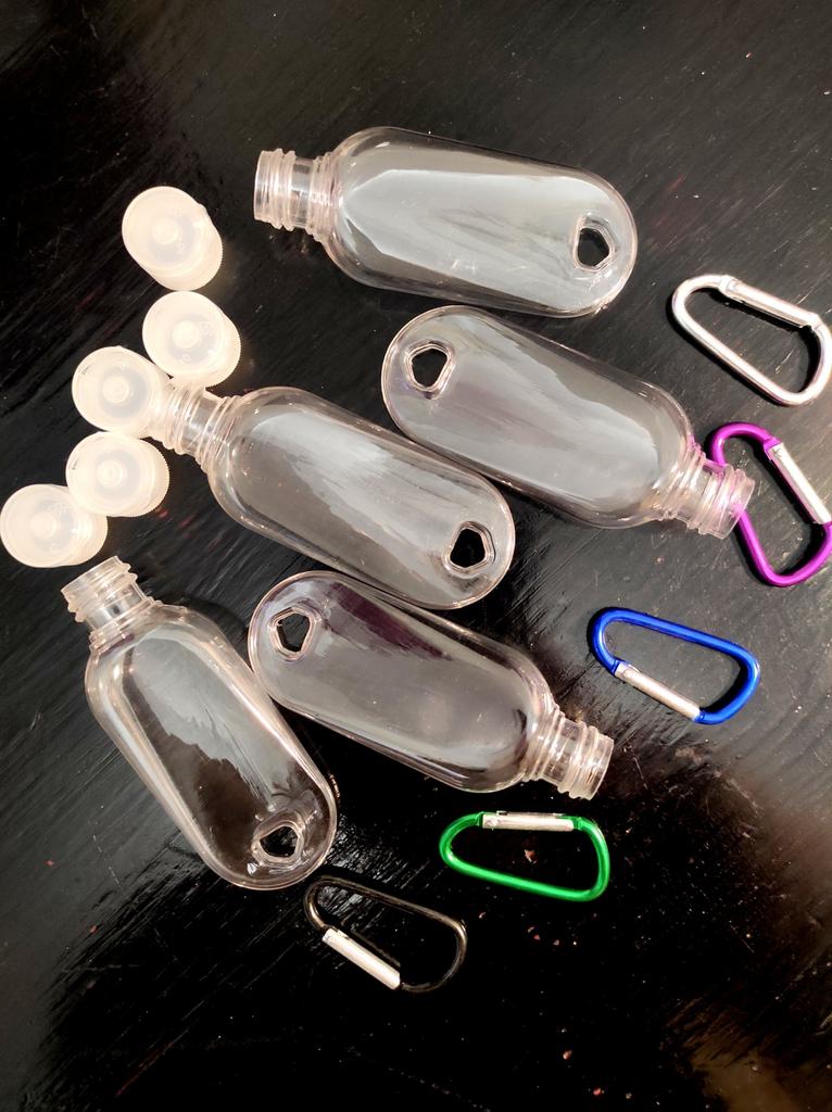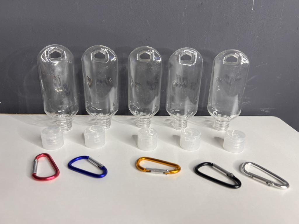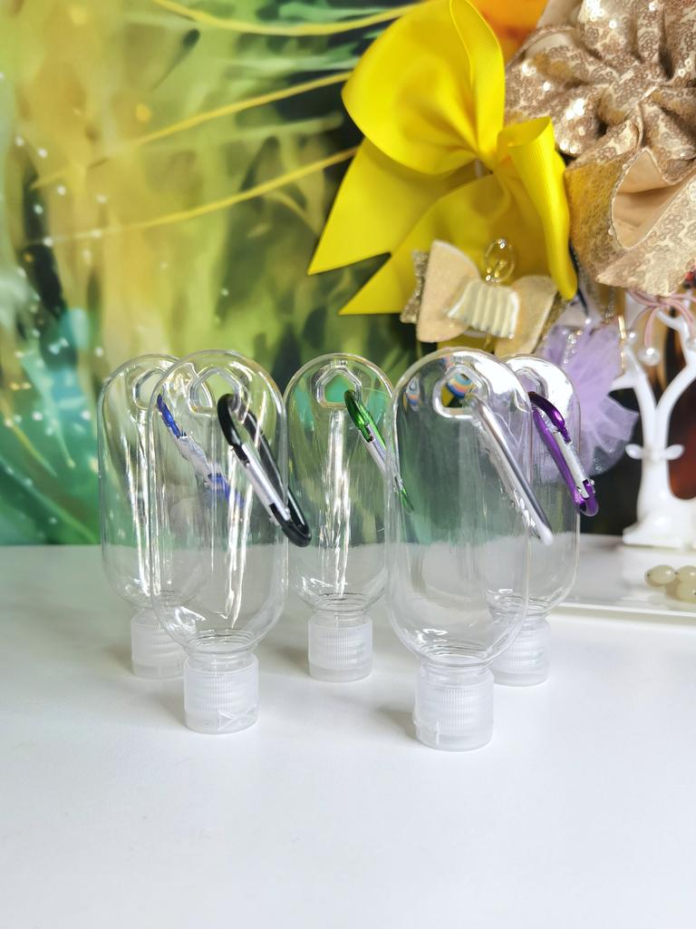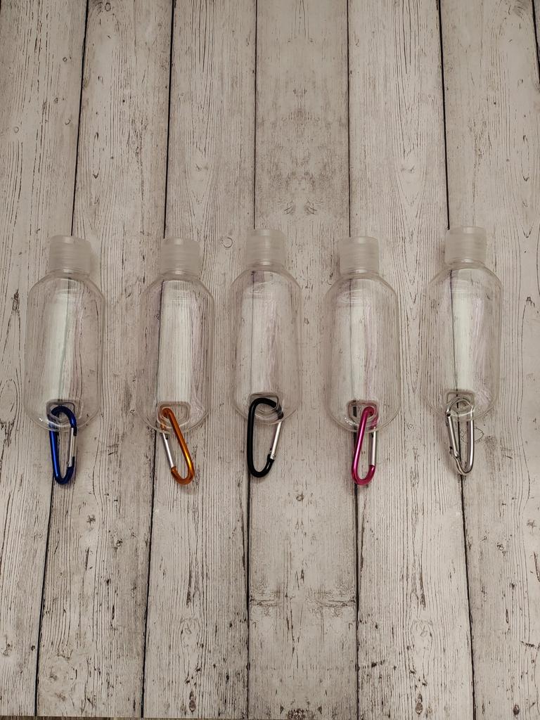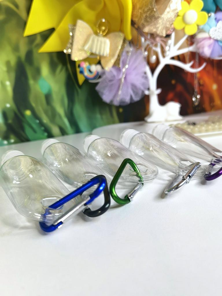 Lahvičky na antibakteriální gel Na karabiny 5 kusů po 30 ml S víkem je otvor pro zavěšení