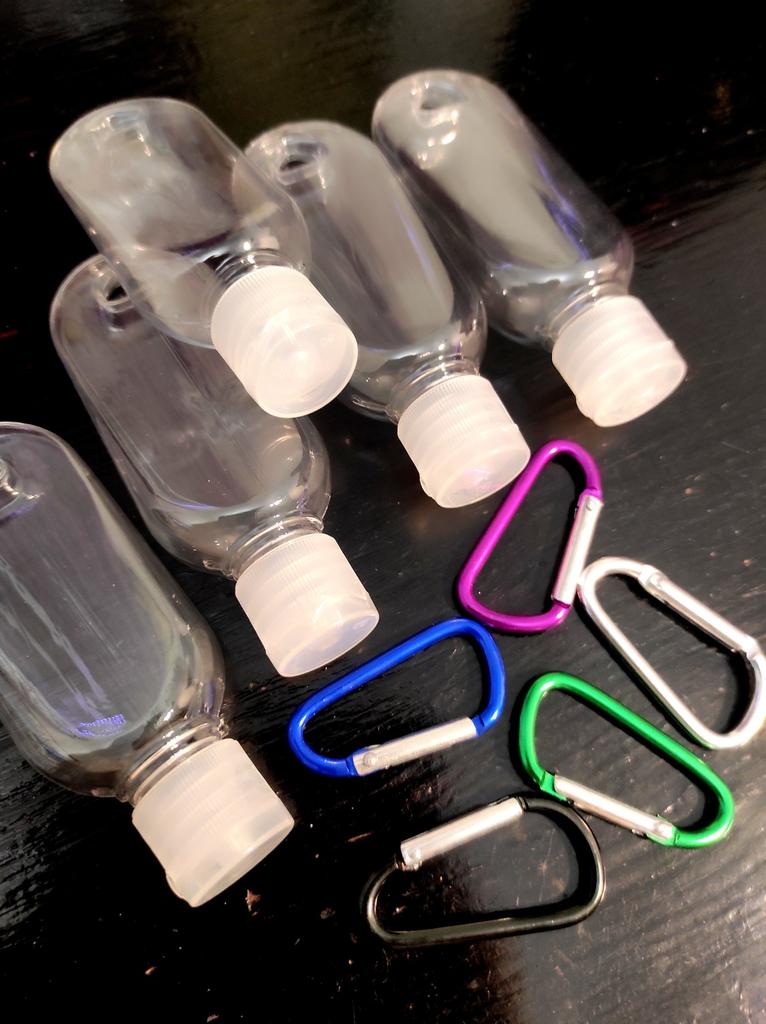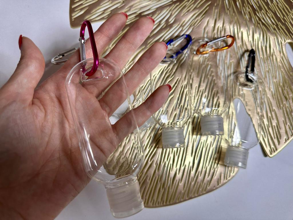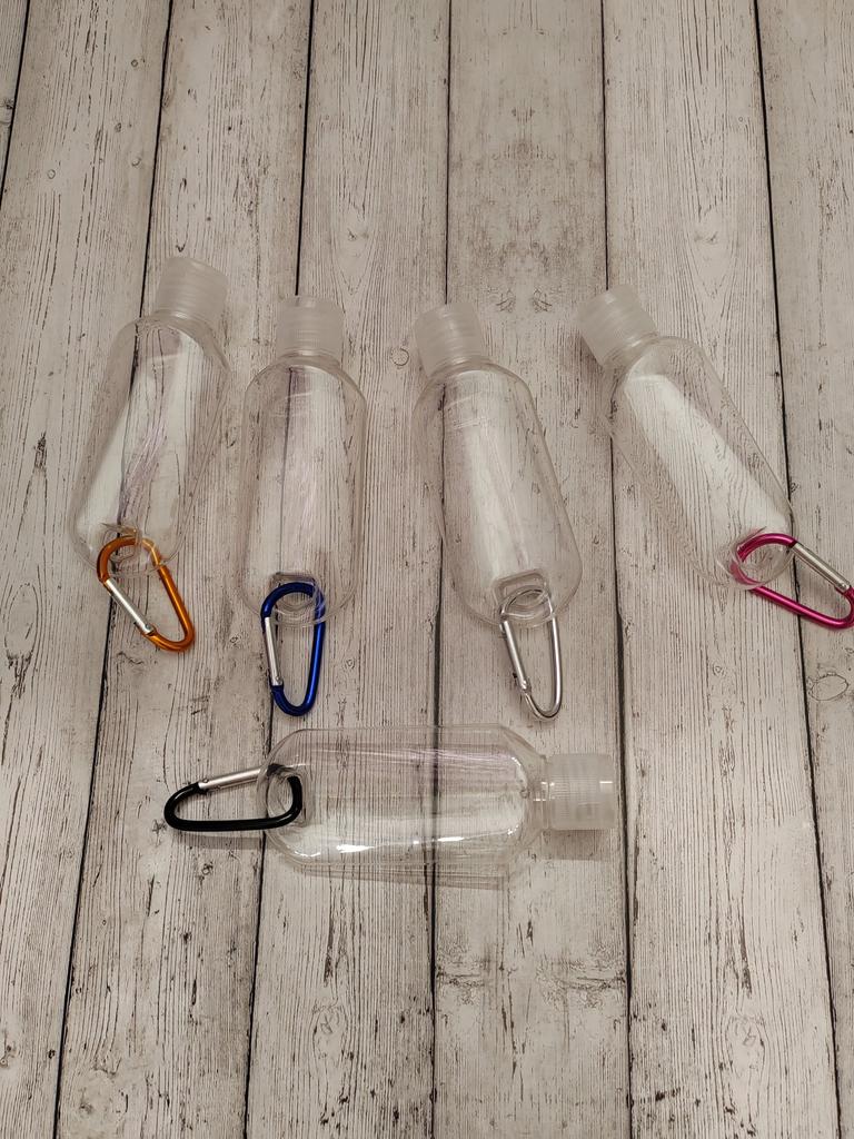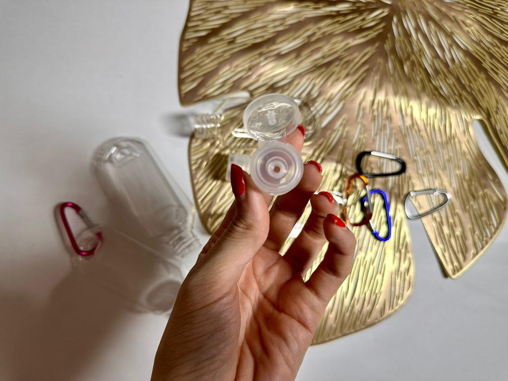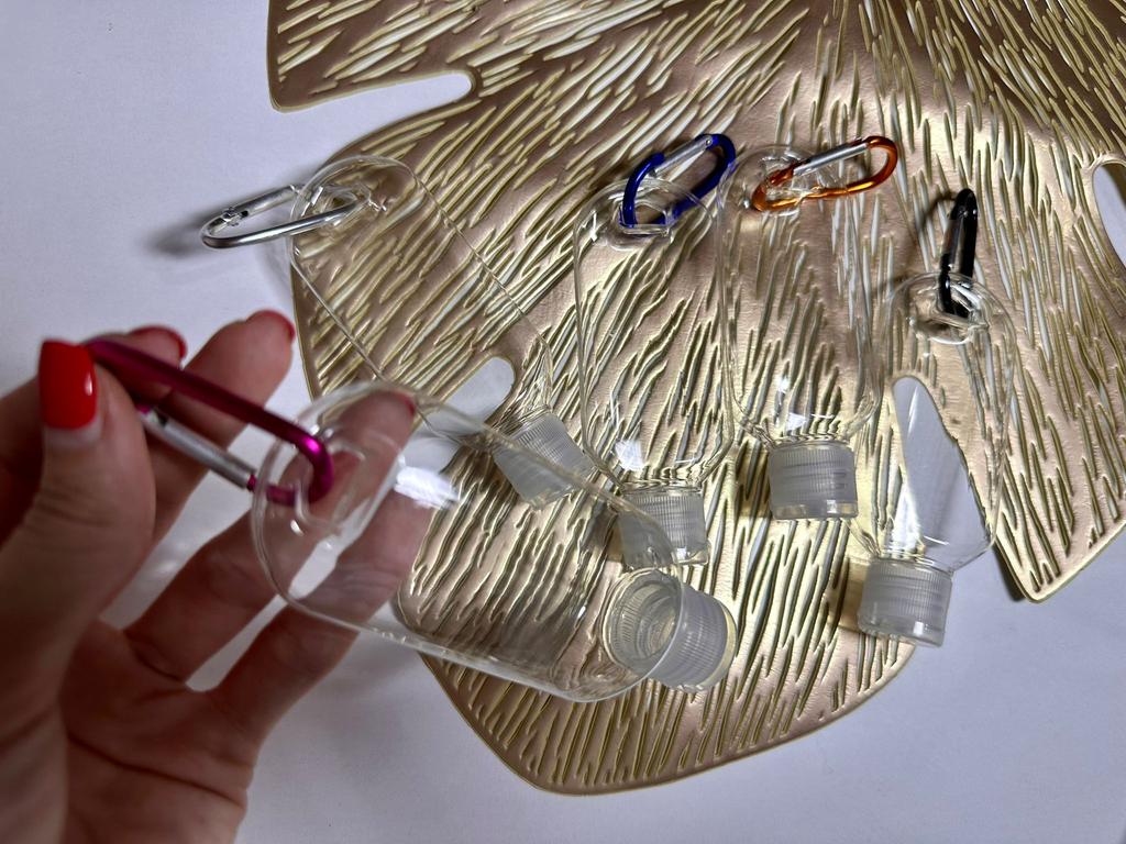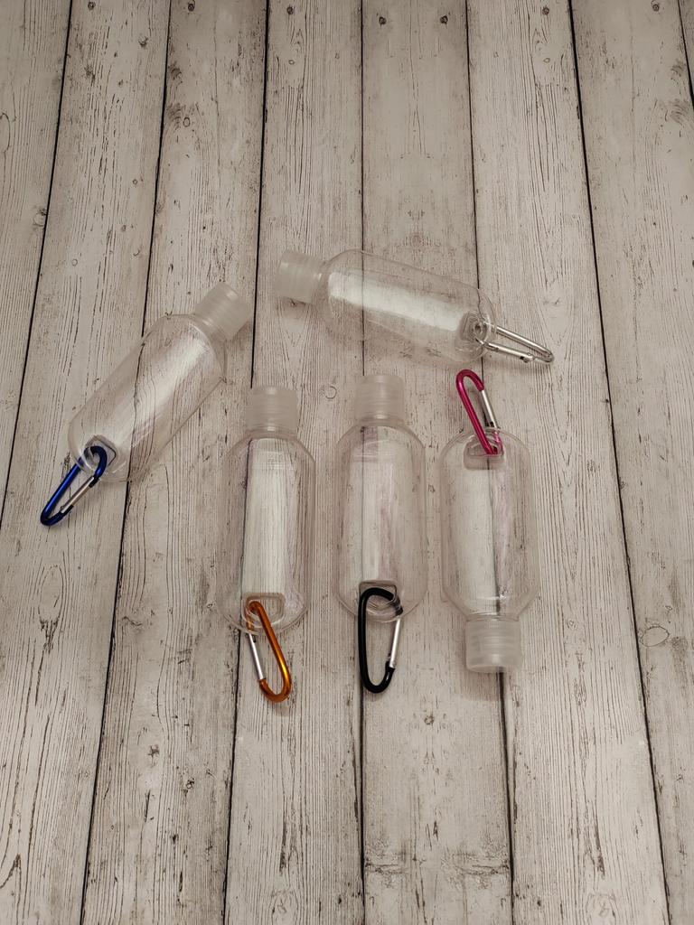 Lahvičky na antibakteriální gel Na karabiny 5 kusů po 30 ml S víkem je otvor pro zavěšení
