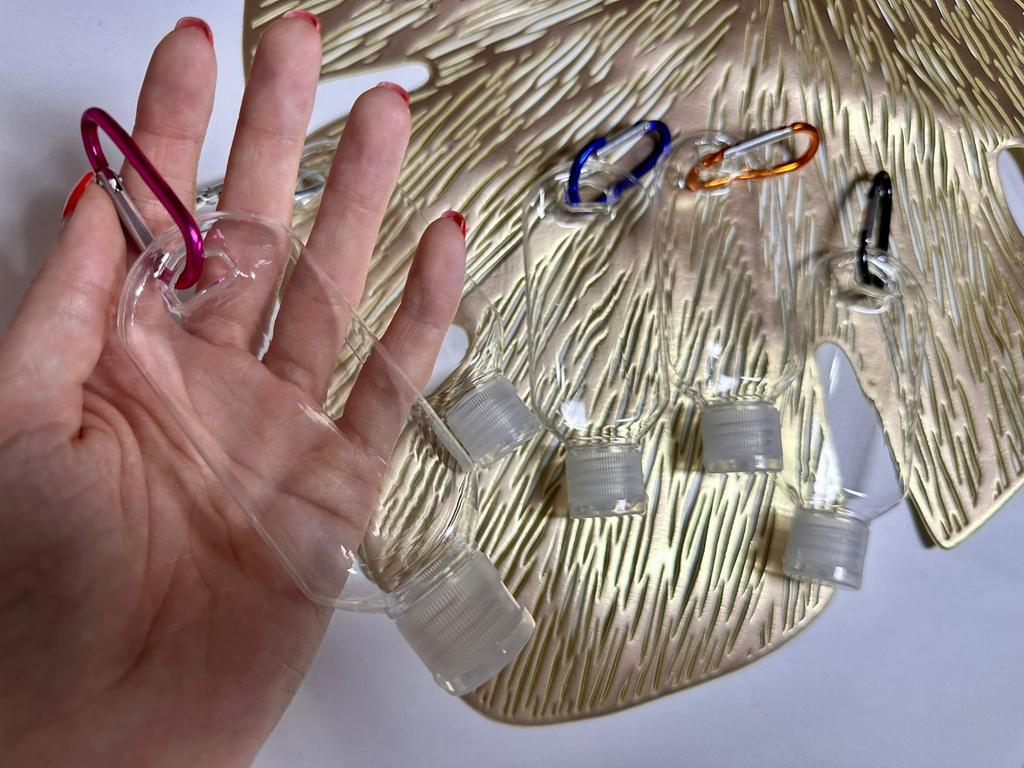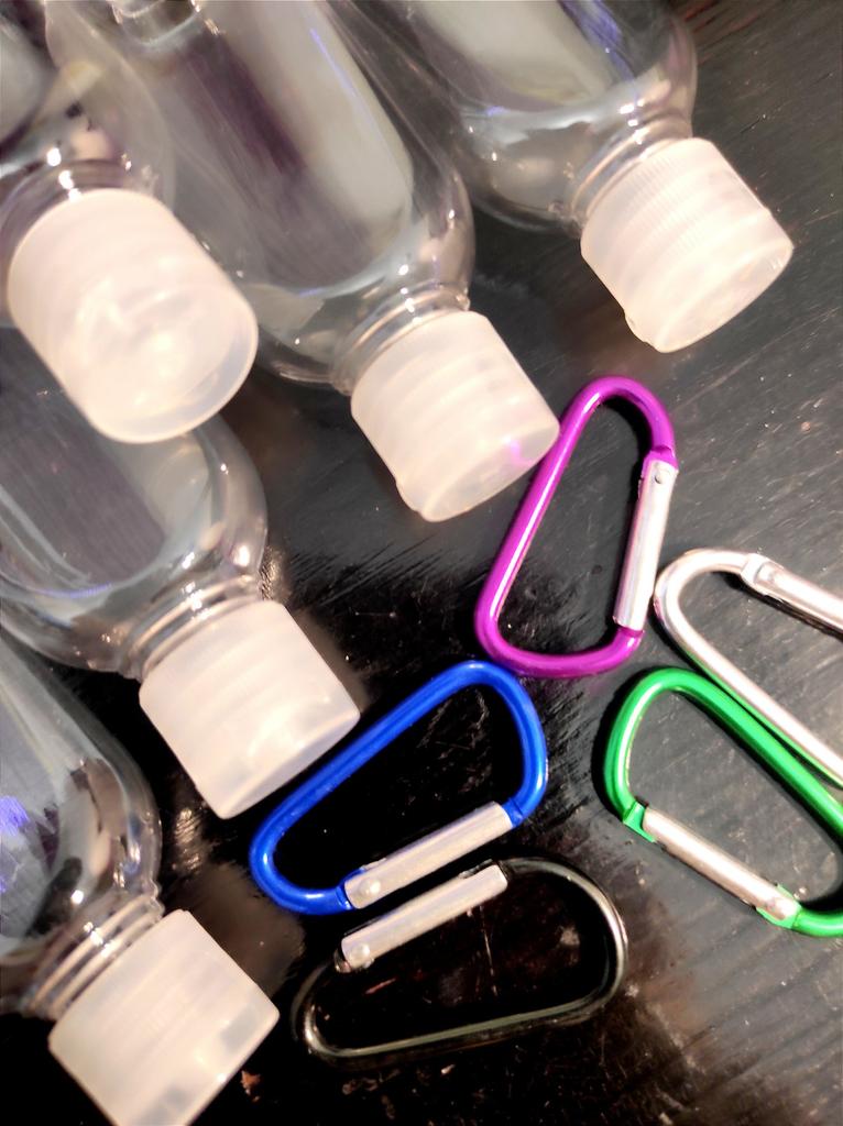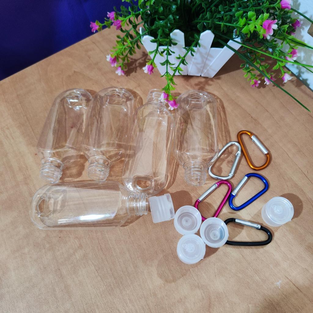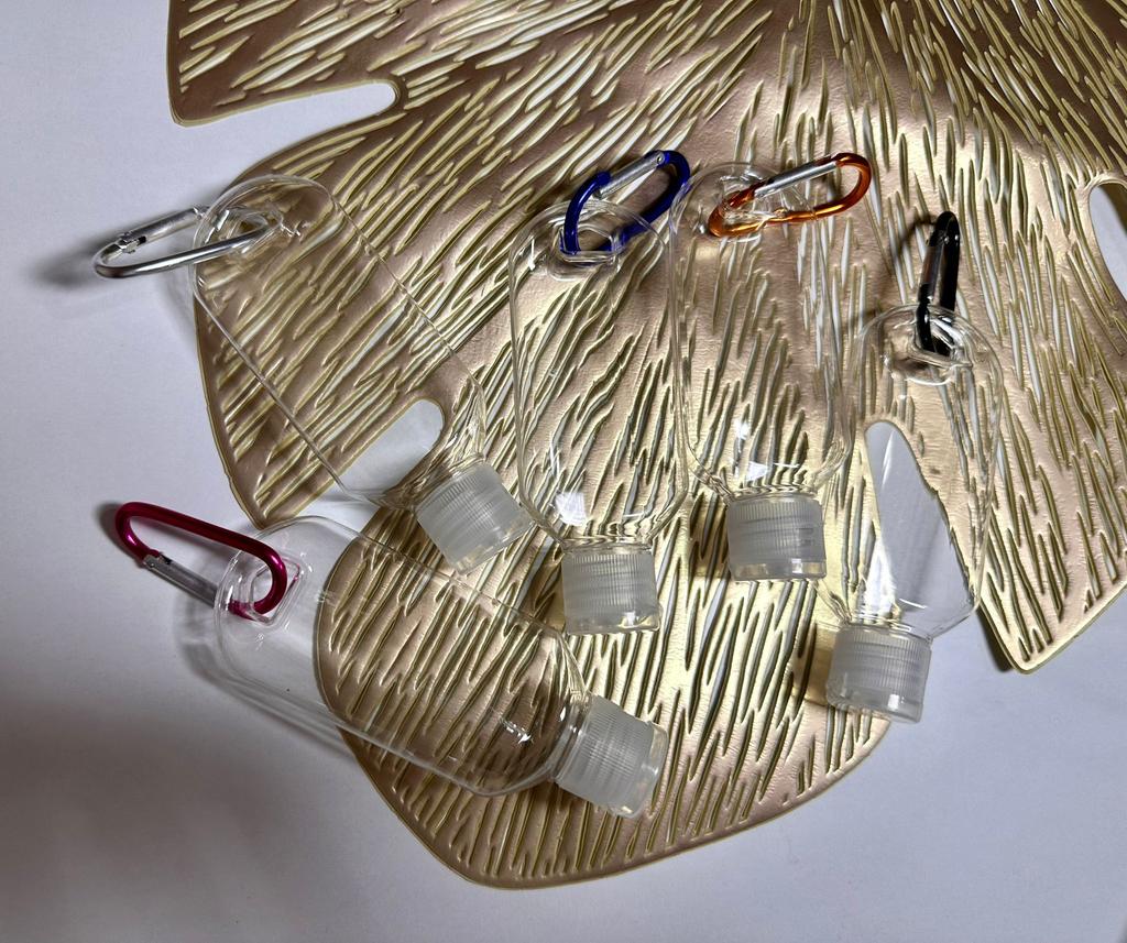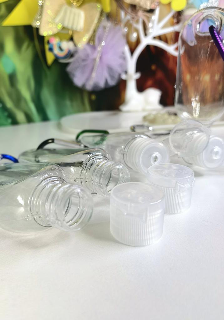Lahvičky na antibakteriální gel Na karabiny 5 kusů po 30 ml S víkem je otvor pro zavěšení