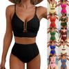 Letní bikiny s výstřihem do V, dvoudílná sada, jednobarevné, žebrované, hluboké, s podprsenkou, plavky