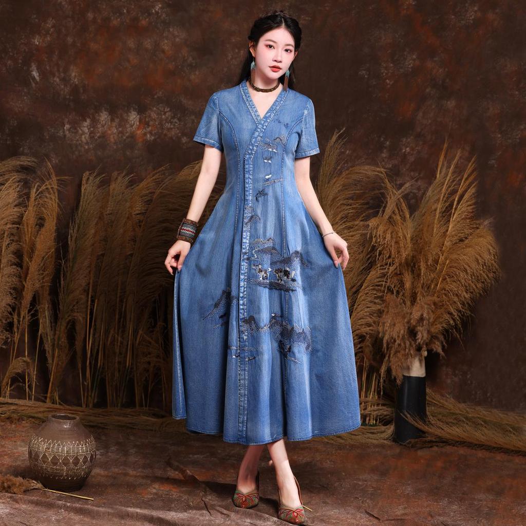 Johnature Léto Ženy Móda Čínský styl Výšivka Kovboj Neformální šaty Vintage šaty s krátkým rukávem a výstřihem do V